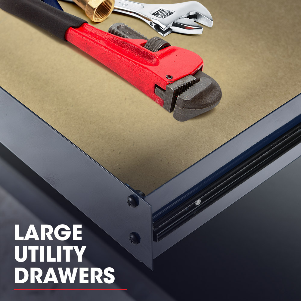 Spanning the entire 120cm product width is a large pegboard on which you can neatly organise your hand tools. Side-by-side under counter drawers are perfect for storing consumables and protecting items from dust. The generously sized enamel coated particle benchtop provides the durability needed for most of your DIY woodworking projects.