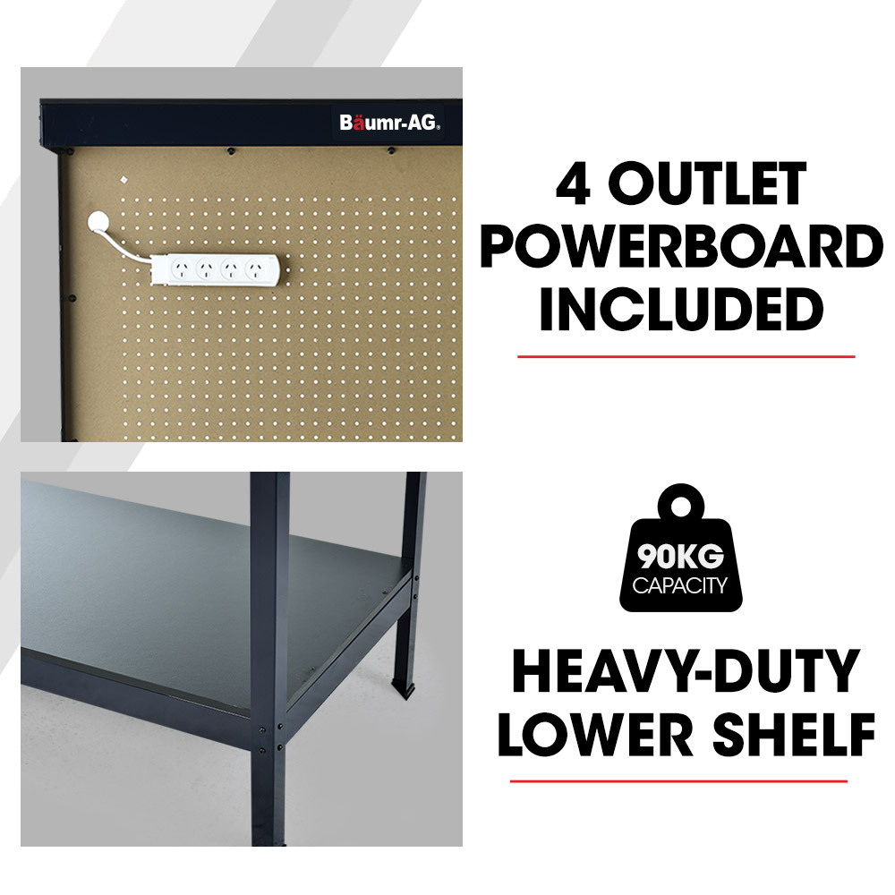 The Baumr-AG Multipurpose Workbench with Work Light has everything you need to keep your workspace organised and functioning smoothly. It has an impressive 250kg total capacity distributed between pegboard, drawers, benchtop, and bottom shelf. The entire steel frame is enamel coated to resist corrosion and prevent damage from any chemical spills.
