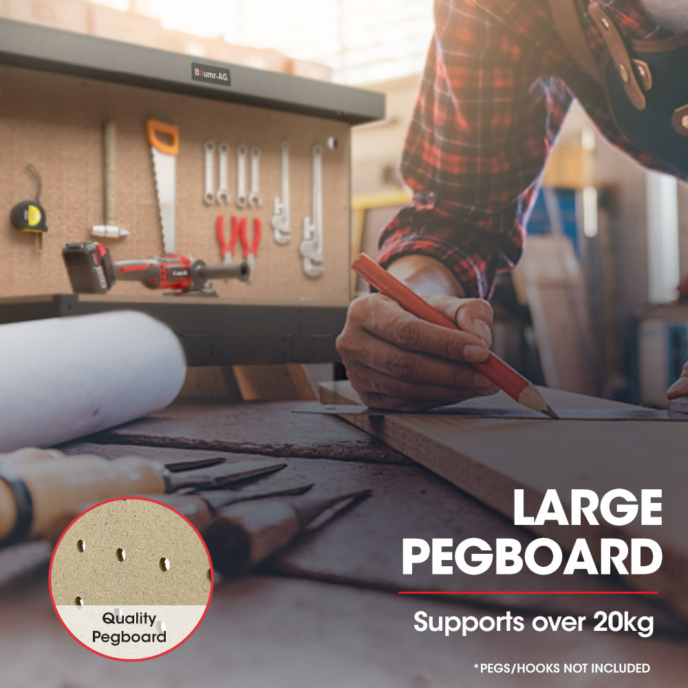 The Baumr-AG multi-purpose work bench has an integrated LED worklight for optimal visibility in any room. It also comes complete with a four socket 10 amp power board that you can attach wherever you like on the pegboard. Charging and powering your tools and accessories now couldn’t be easier—making the Baumr-AG work bench a great all-arounder for any home garage or workshop.