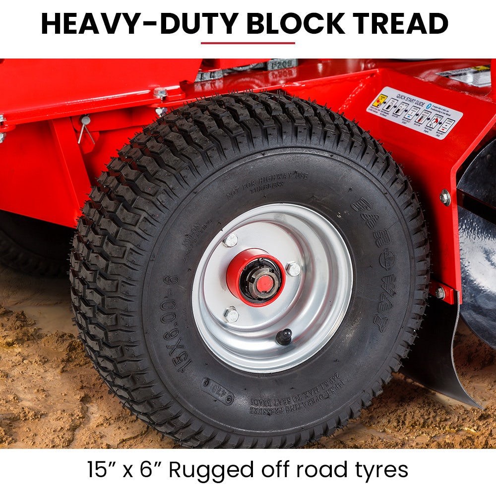 Baumr-AG has engineered this trencher with premium components. The tungsten carbide digging teeth are mounted on a heavy-duty chain. They are driven by a hardened steel rear sprocket. The centrifugal clutch and adjustable throttle digging system prevent over-torque and machine kicking. The front and rear grease nipples are great for easy maintenance of machine components. The XL 15″ x 6″ extra-wide all-terrain tyres handle rough terrain effortlessly.