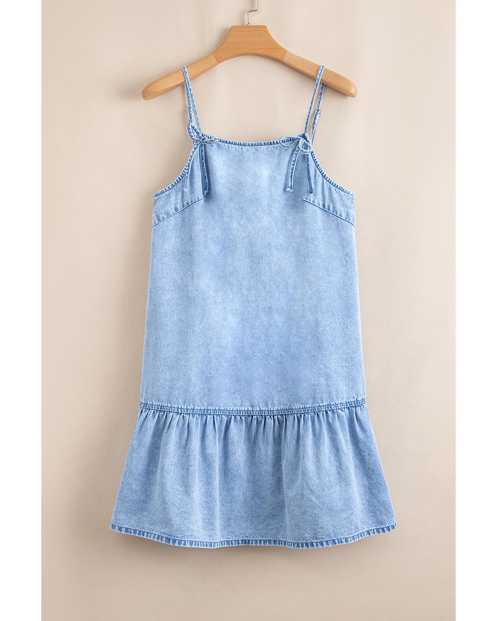 - Beau Blue Bow Detail Spaghetti Straps Ruffle Hem Denim Short Dress