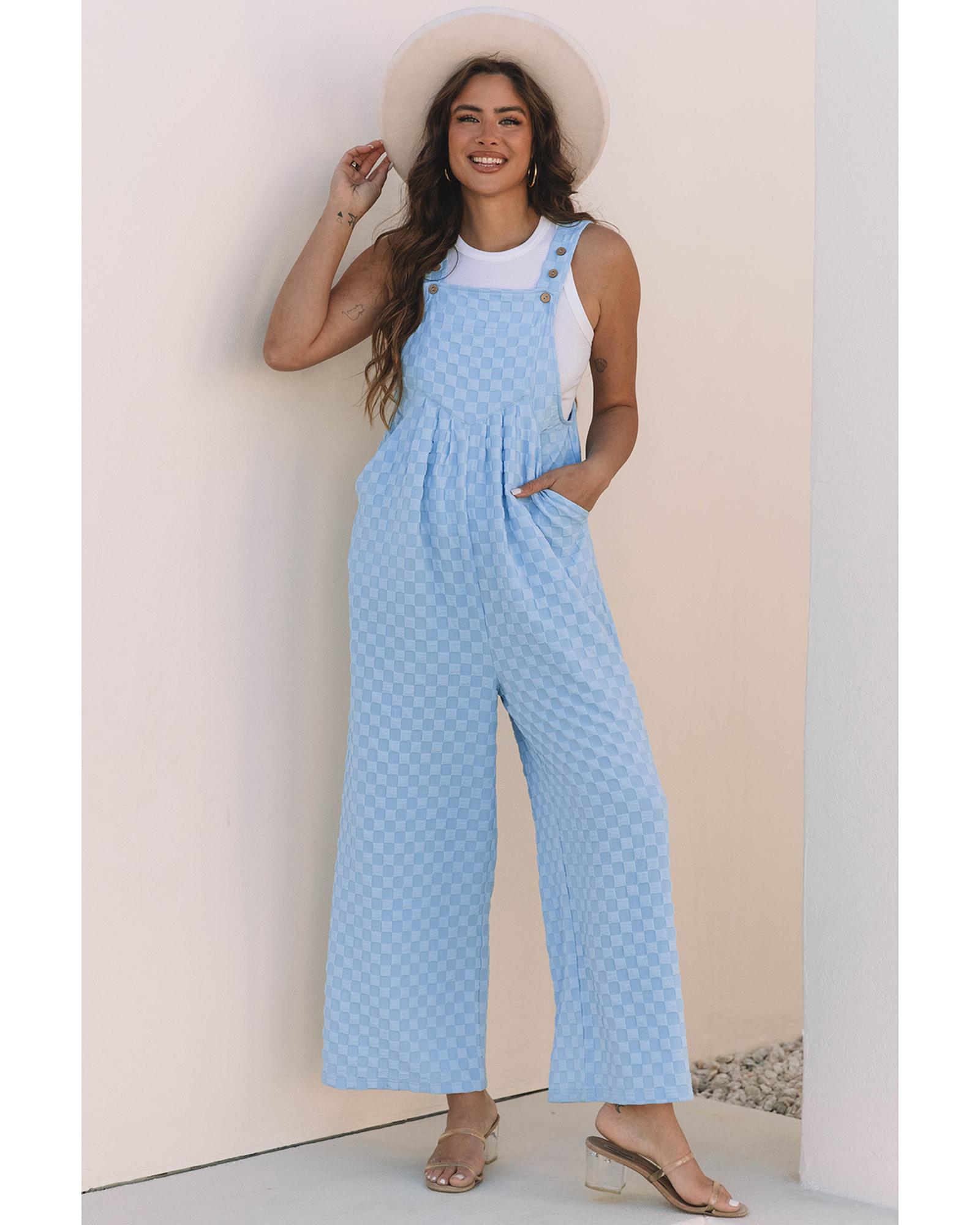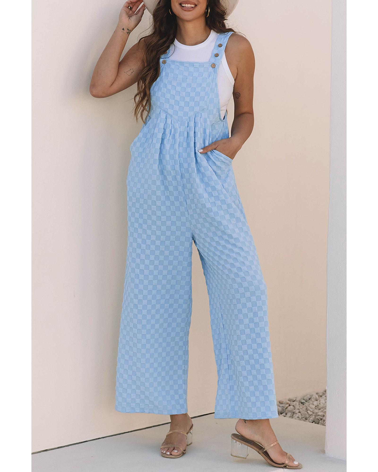 Beau Blue Checkered Pocketed High Waist Wide Leg Overall – XL