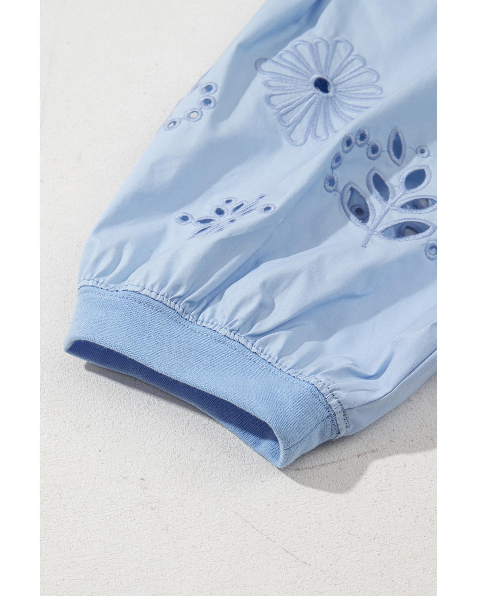 Beau Blue Eyelet Flower Embroidered Puff Short Sleeve Patchwork Crew Neck Blouse – M
