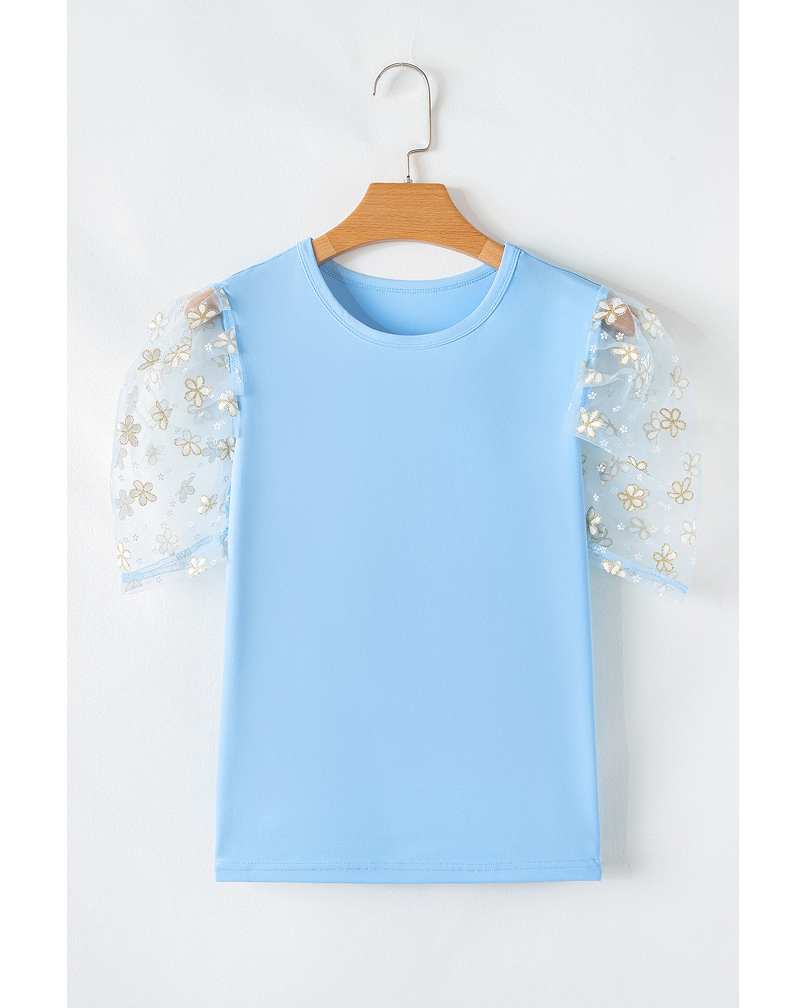 Beau Blue Floral Mesh Puff Sleeve Crew Neck Top – L