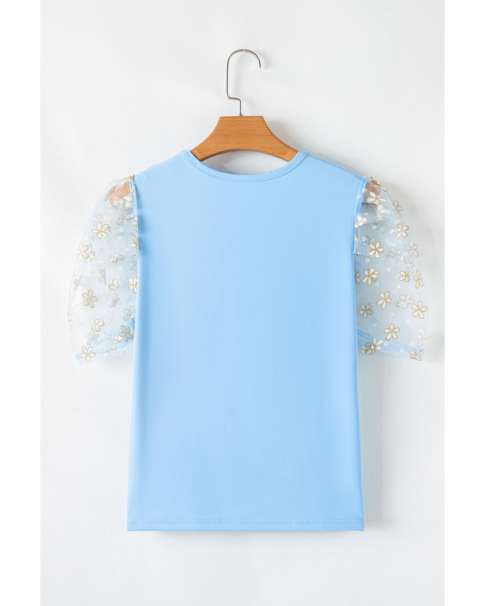 Beau Blue Floral Mesh Puff Sleeve Crew Neck Top – S