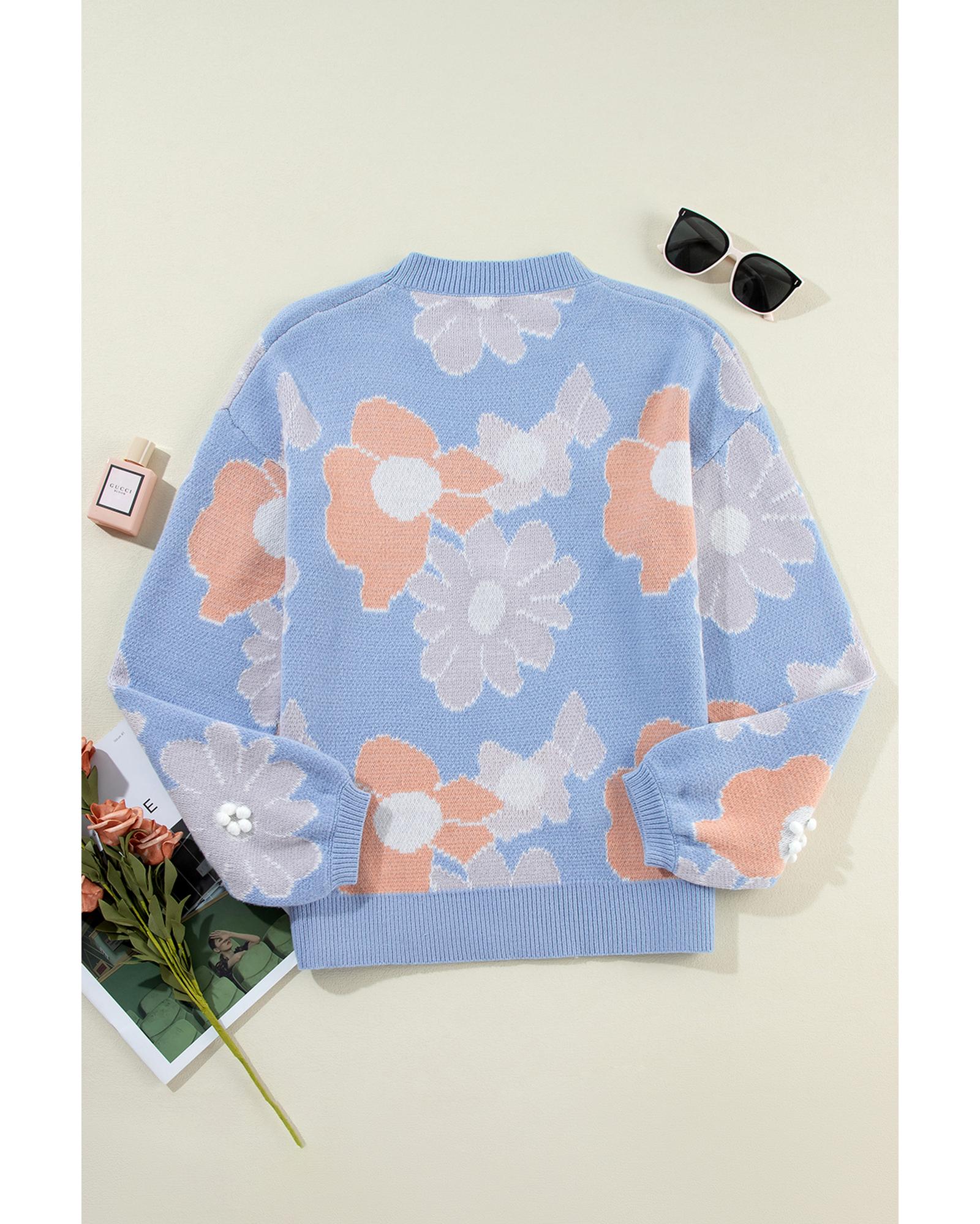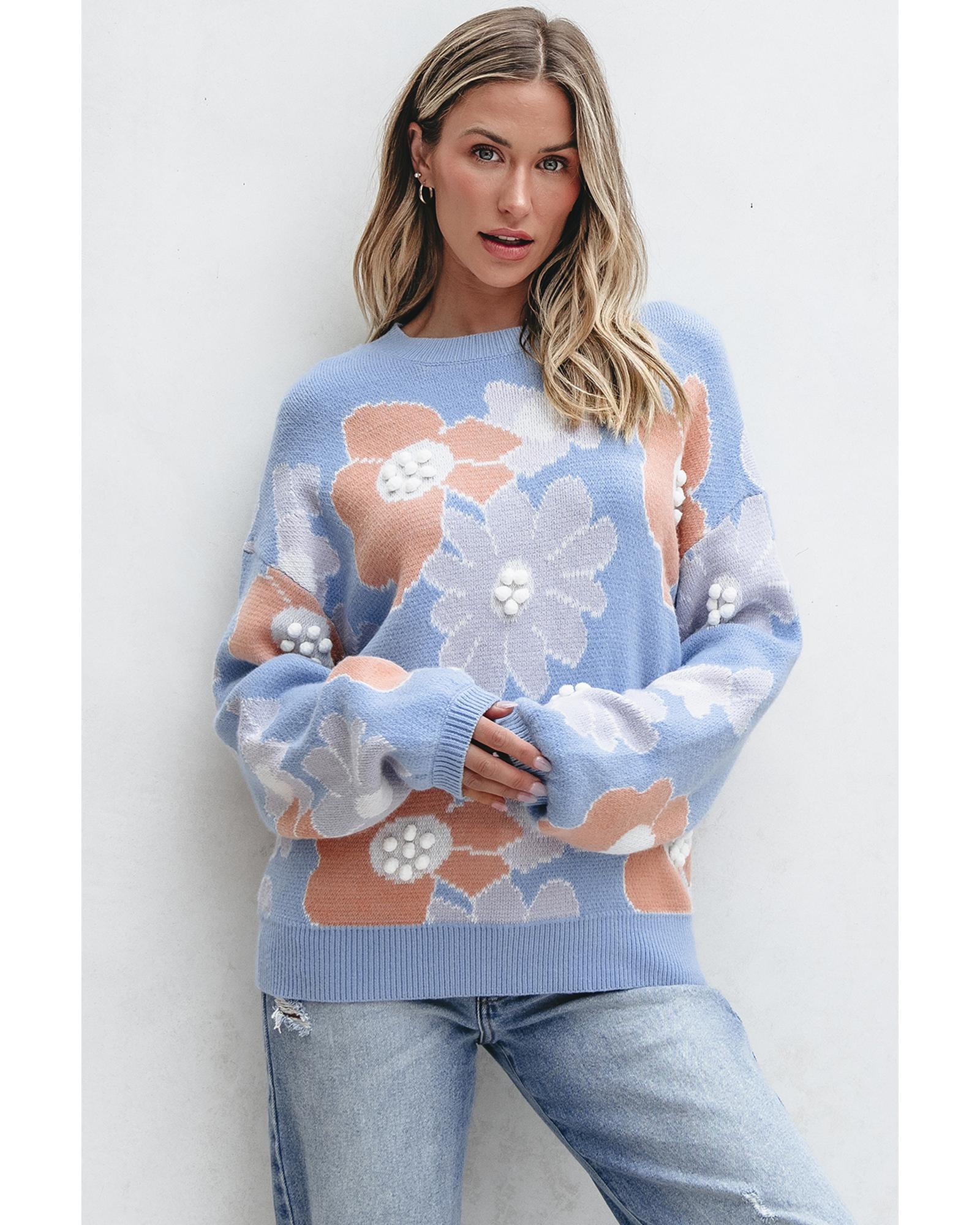 Beau Blue Floral O Neck Drop Shoulder Knitted Sweater – M