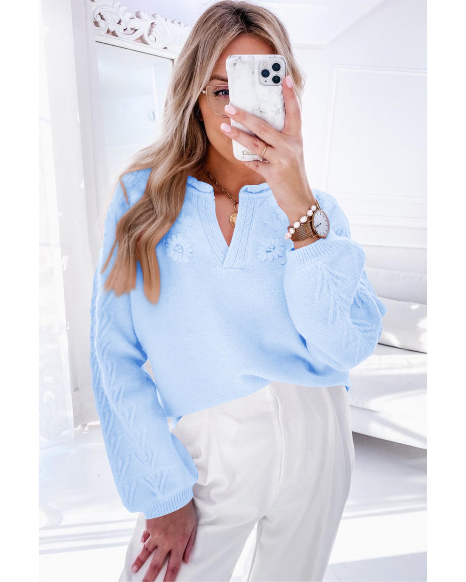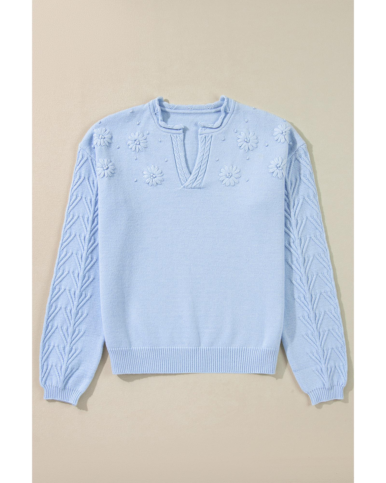 Beau Blue Flower Detail Knitted Notched Neck Sweater – L