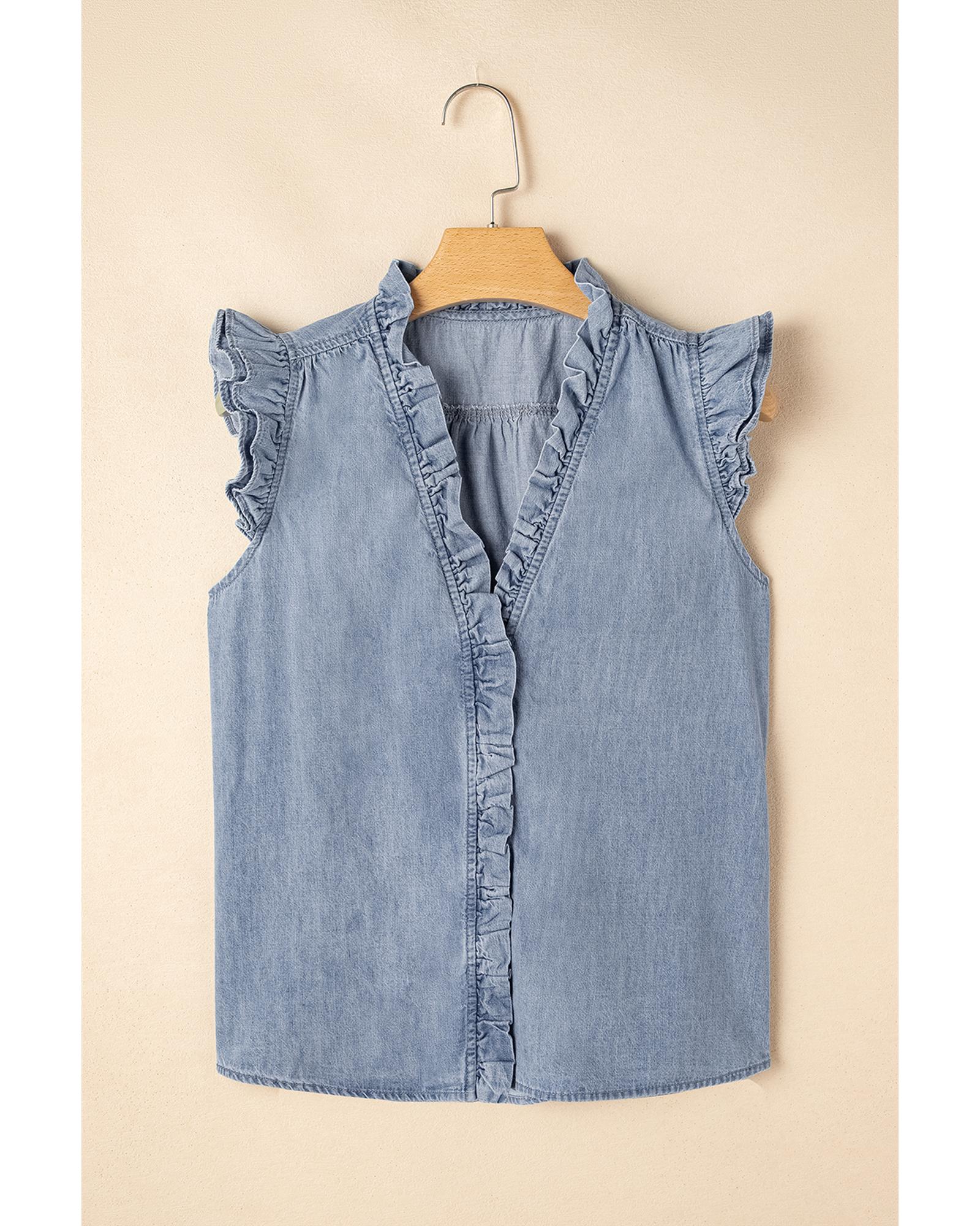 Beau Blue Frilly Ruffle Trim V Neck Chambray Tank Top – S