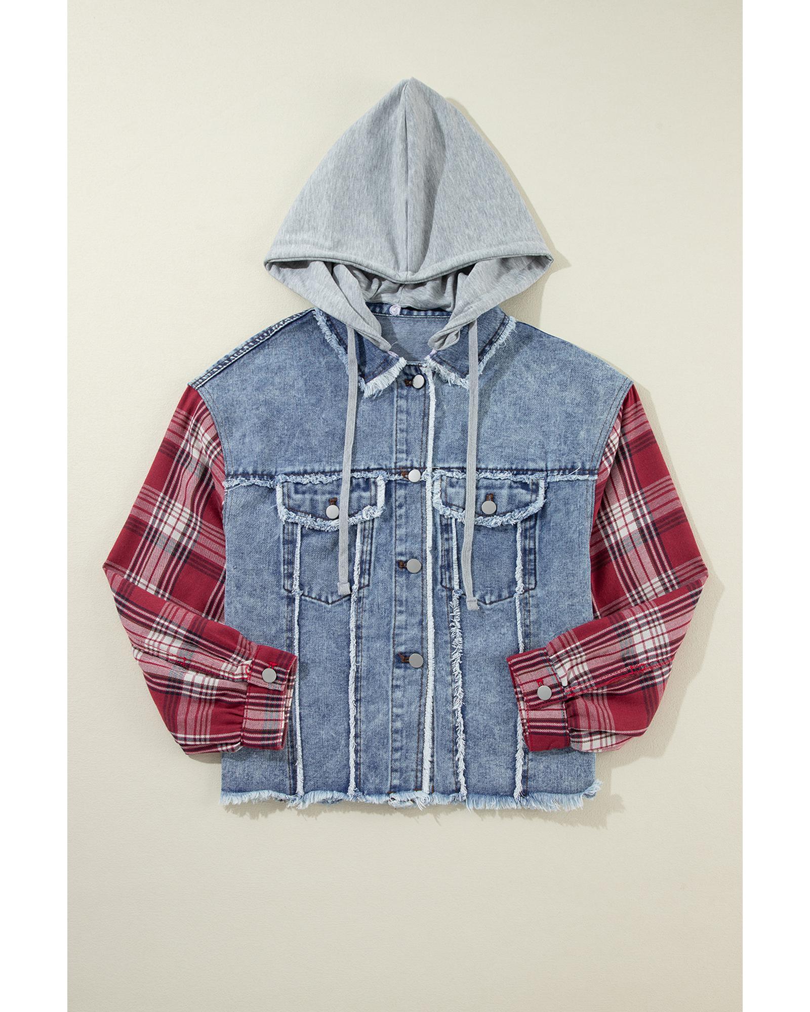 Beau Blue Plaid Print Patchwork Hooded Raw Hem Denim Jacket – L