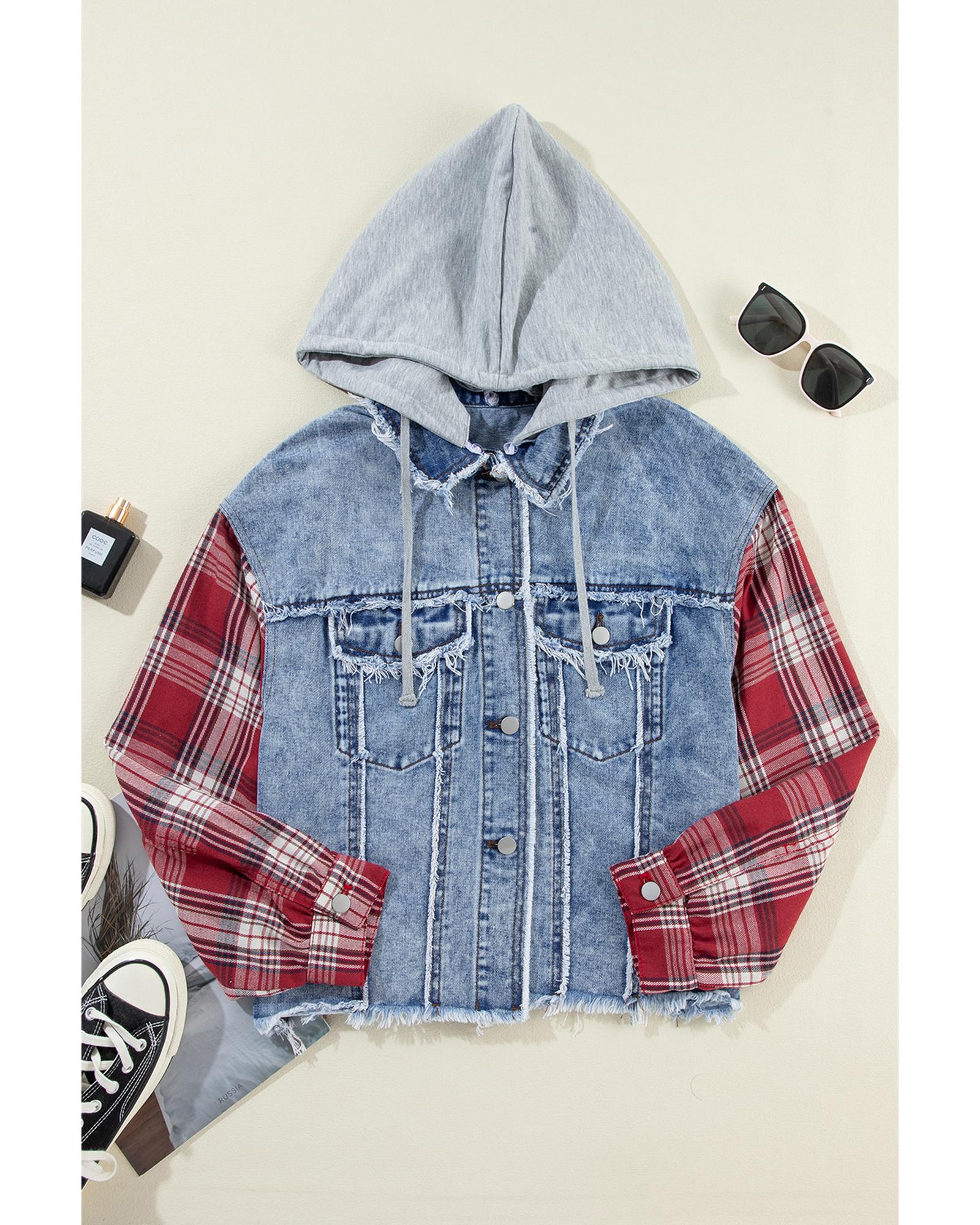 Beau Blue Plaid Print Patchwork Hooded Raw Hem Denim Jacket - S Original price was: $89.99.Current price is: $48.99.