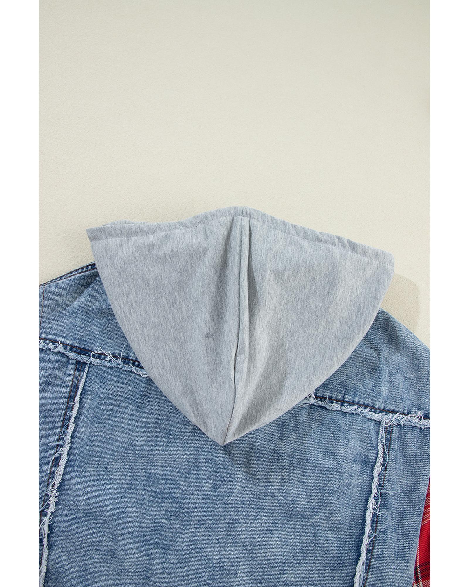 Beau Blue Plaid Print Patchwork Hooded Raw Hem Denim Jacket – S