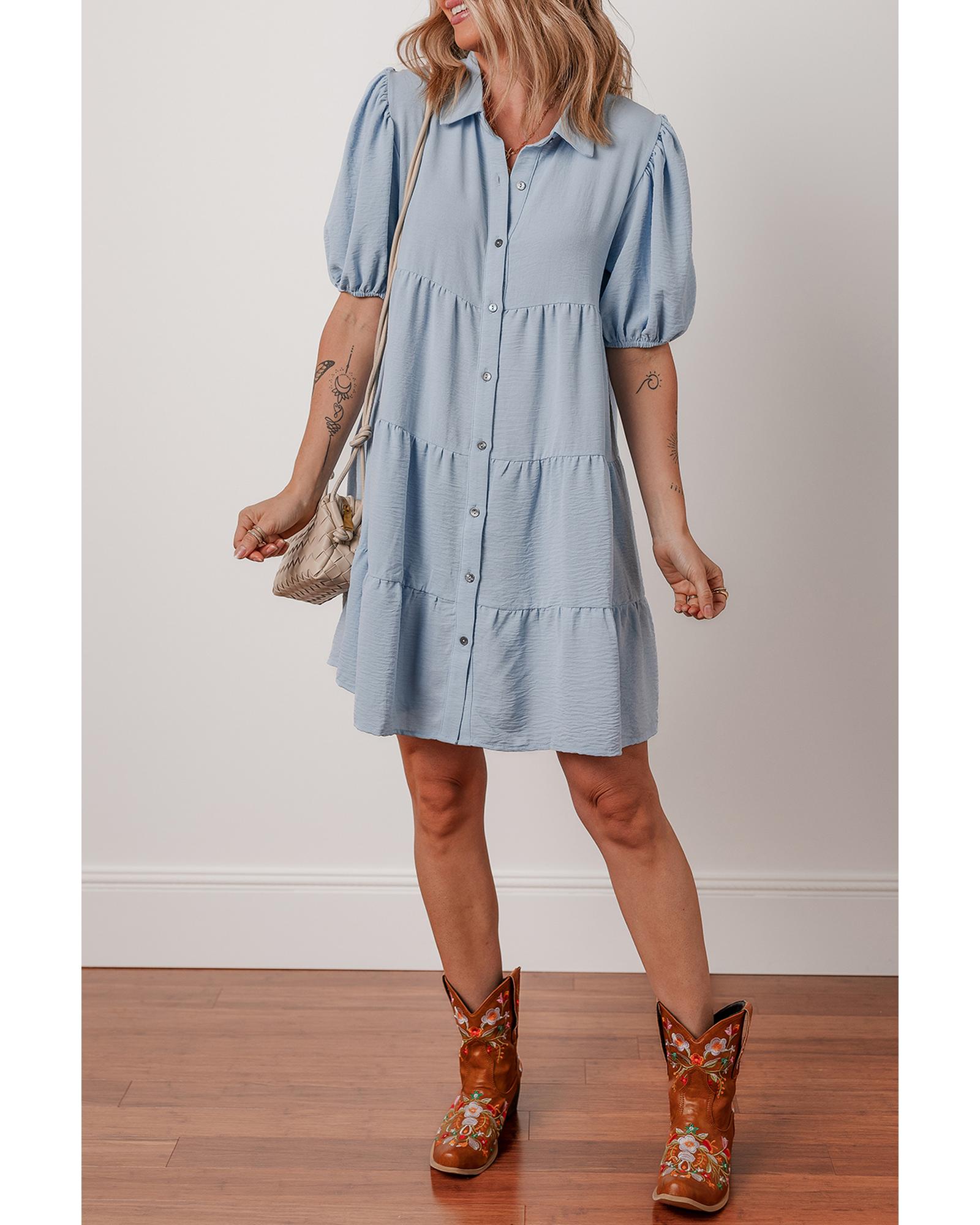Beau Blue Shirt Collar Button Up Short Puff Sleeve Tiered Shift Dress – S