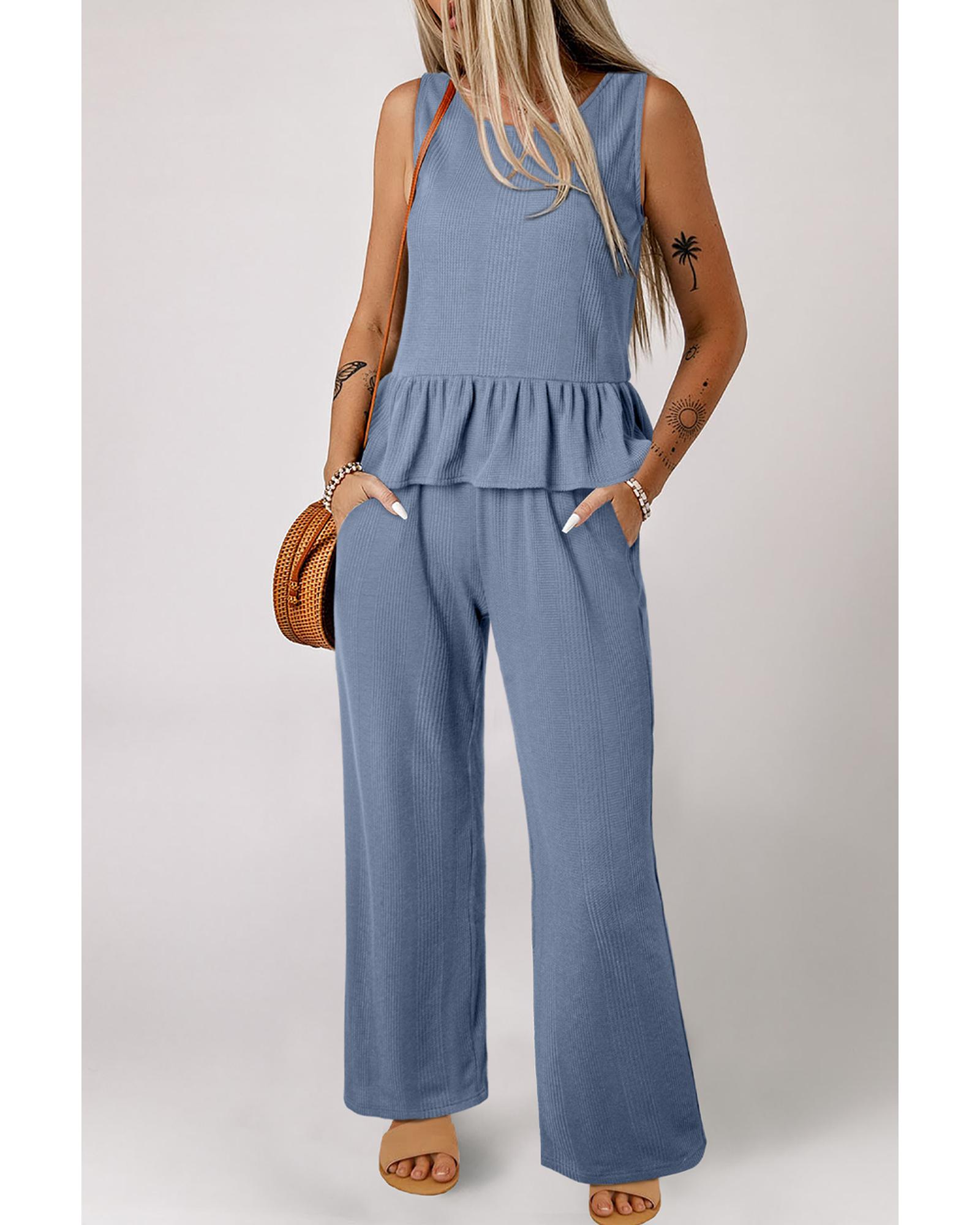 Beau Blue Solid Color Ribbed Ruffle Tank Top and Pants Set – L