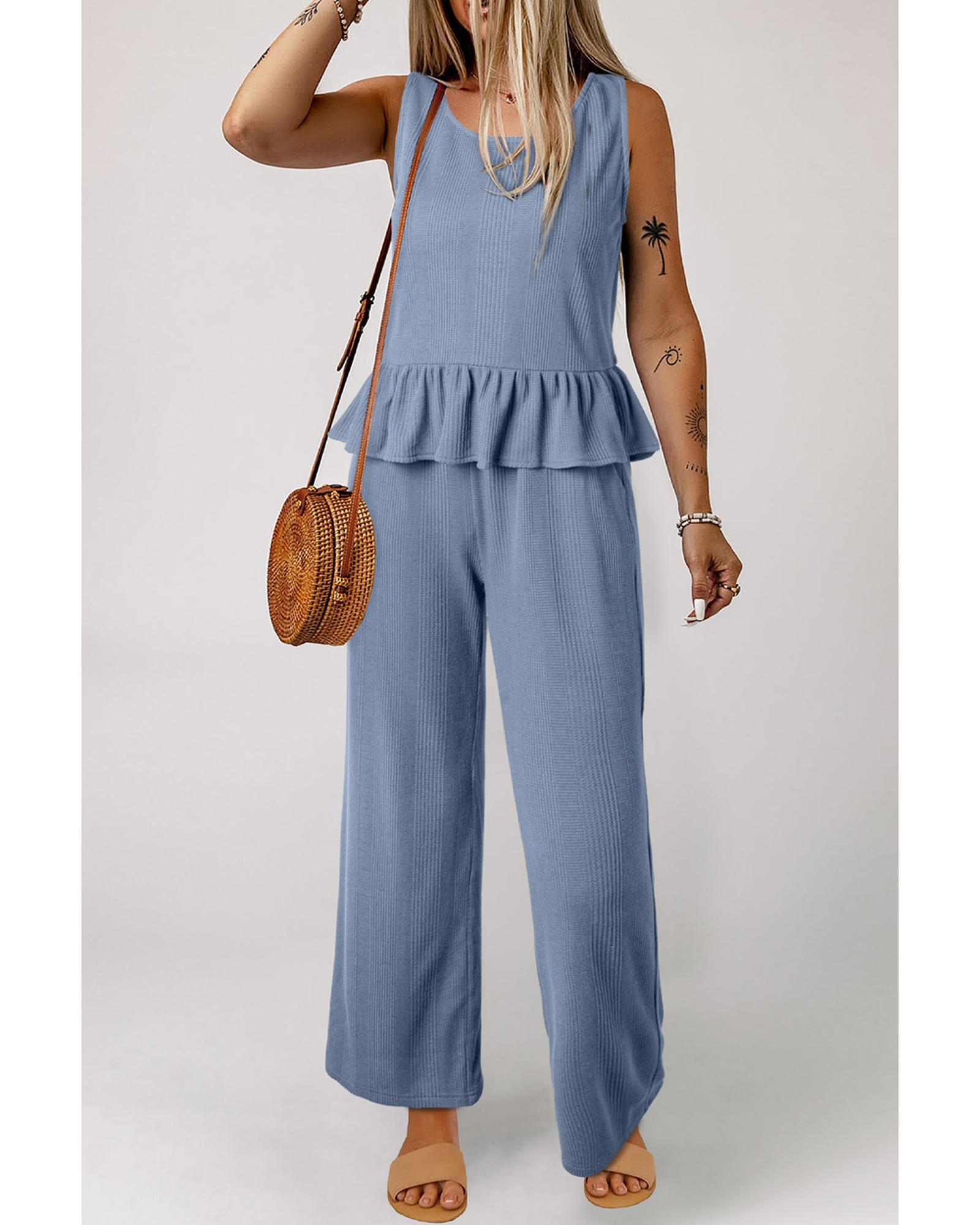 Beau Blue Solid Color Ribbed Ruffle Tank Top and Pants Set – M