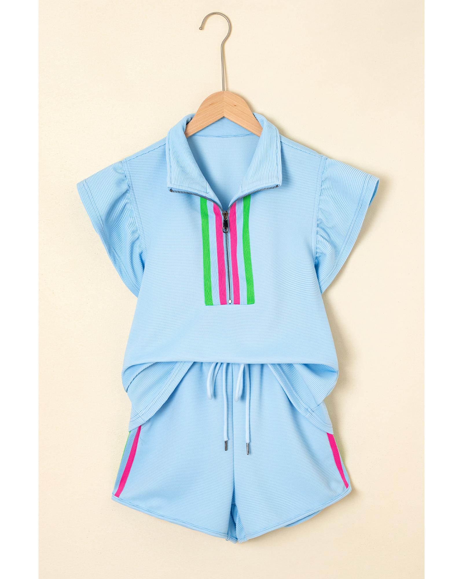 Beau Blue Striped Detail Flutter Sleeve Zipped Collar Short Set – S