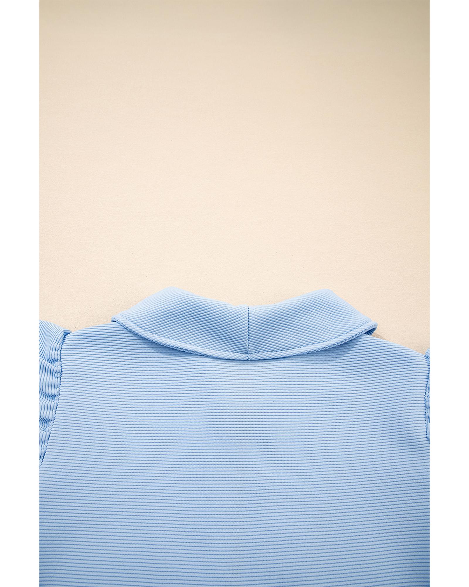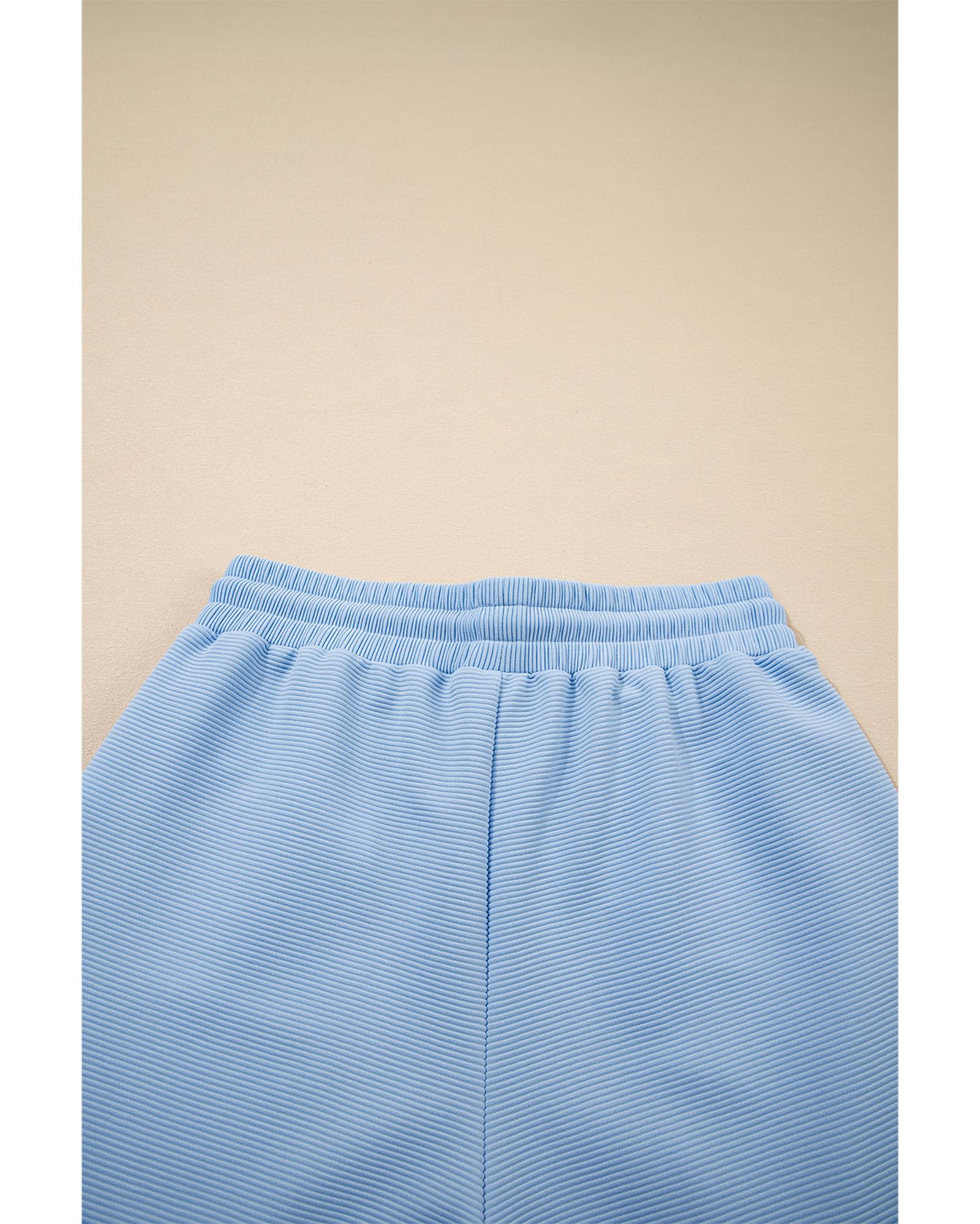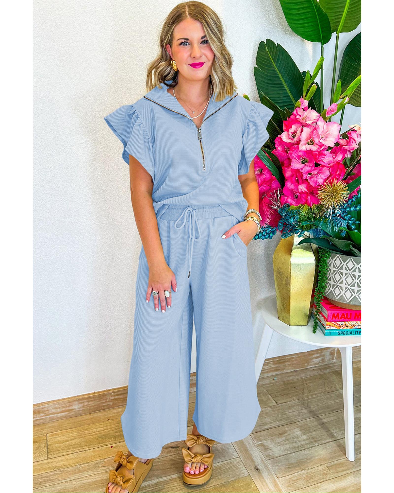 Beau Blue Textured Ruffled Sleeve Zipped Top and Wide Leg Pants Set - L