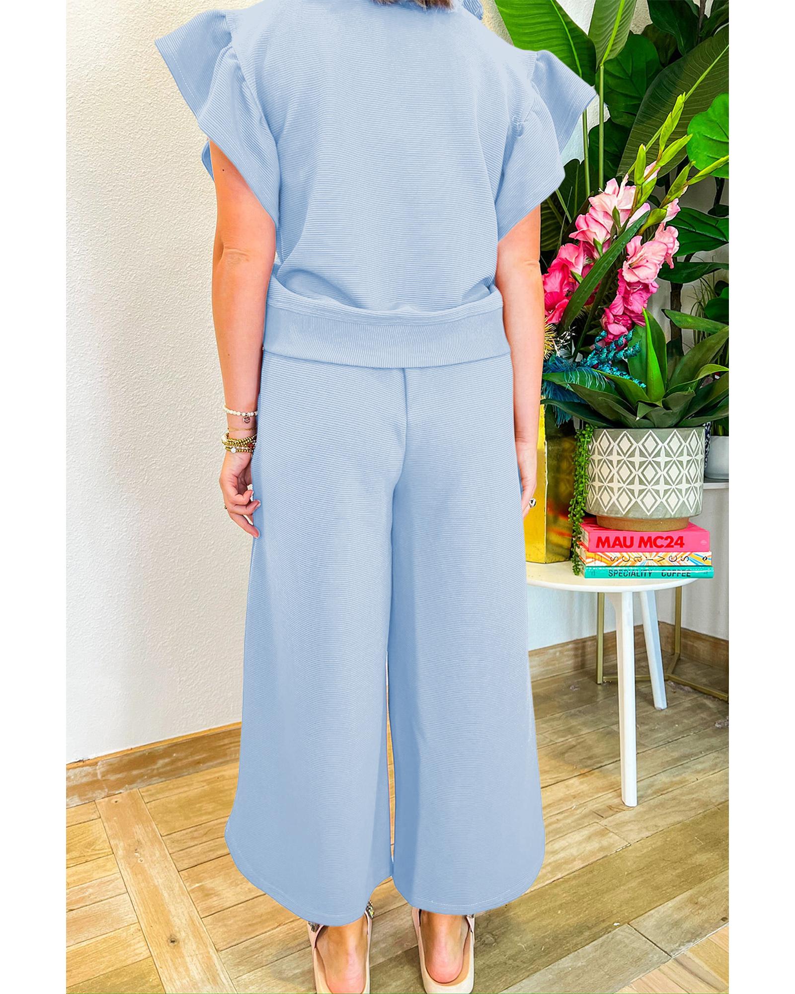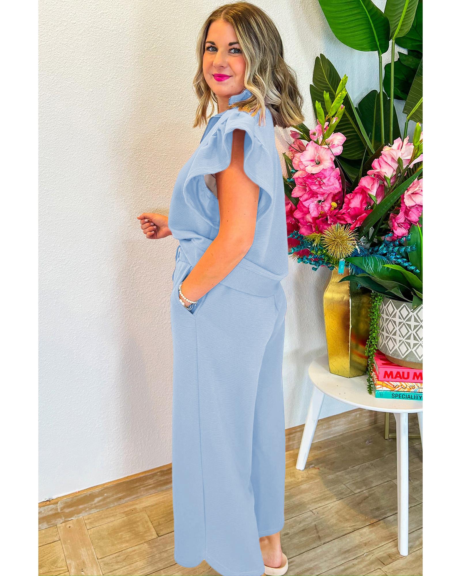 Beau Blue Textured Ruffled Sleeve Zipped Top and Wide Leg Pants Set – S