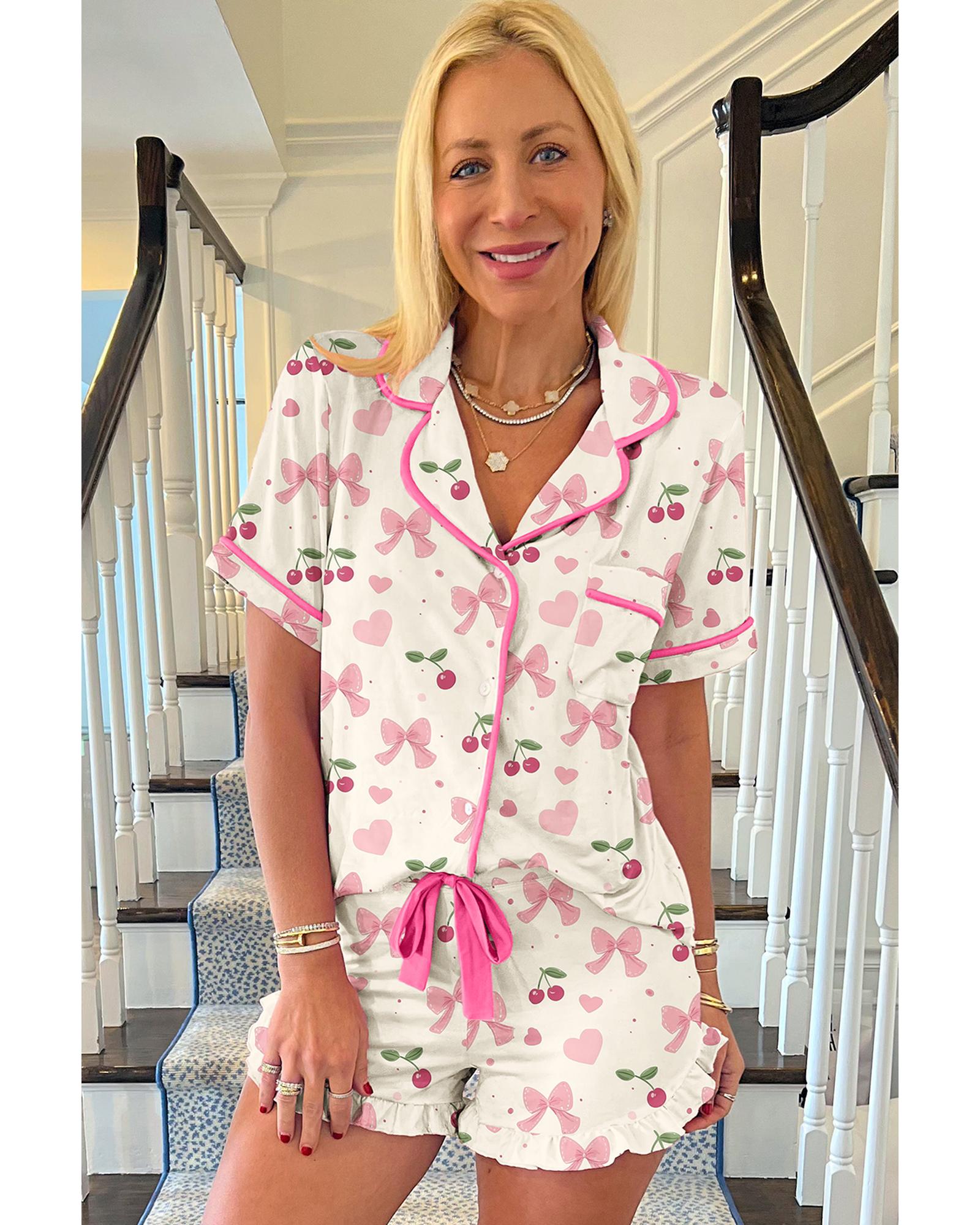 Beige Bow Fruit Print Contrast Pipping Short Pajamas Set – M