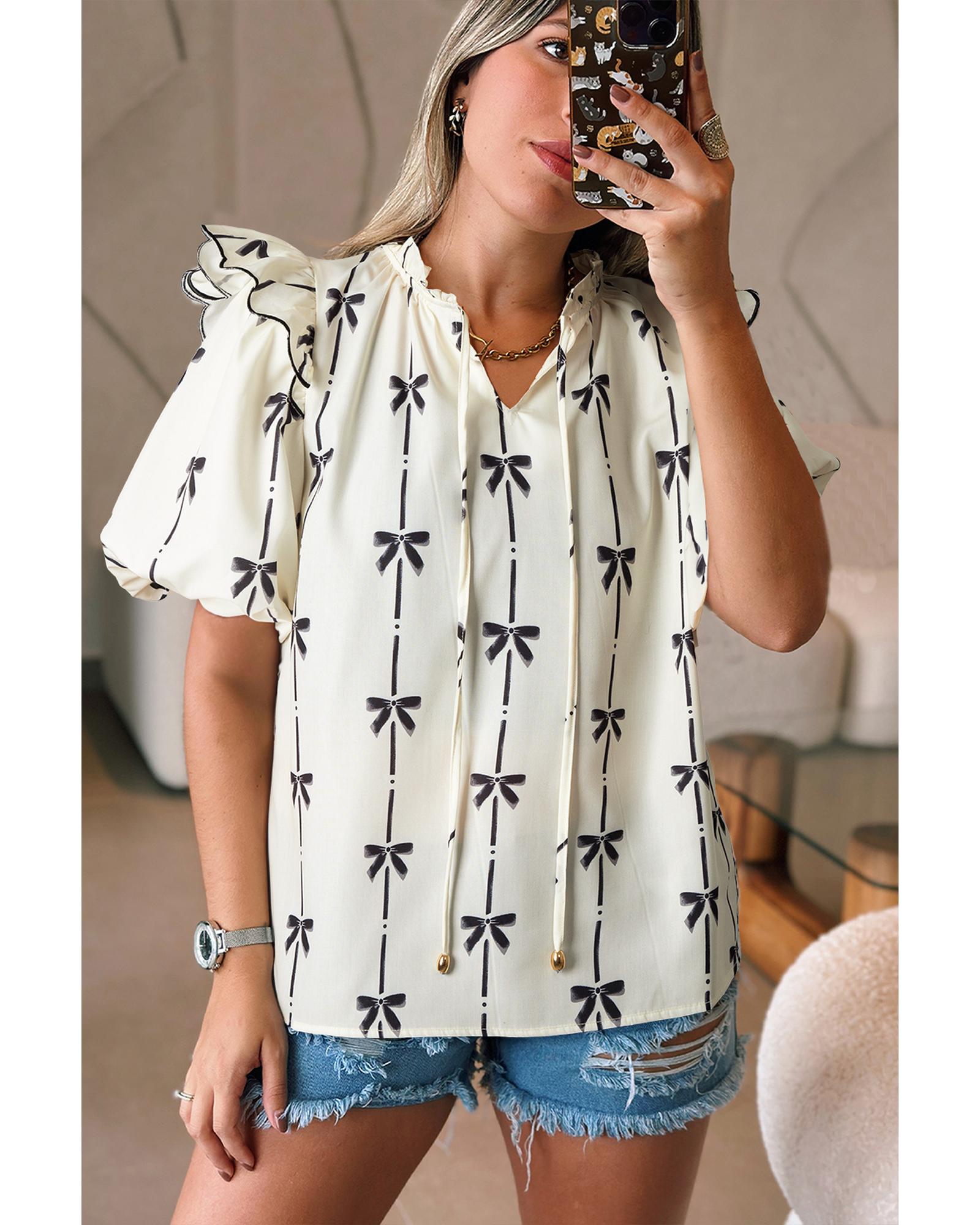 Beige Bow Printed Ruffled Bubble Sleeve Tied Notched V Neck Blouse – L