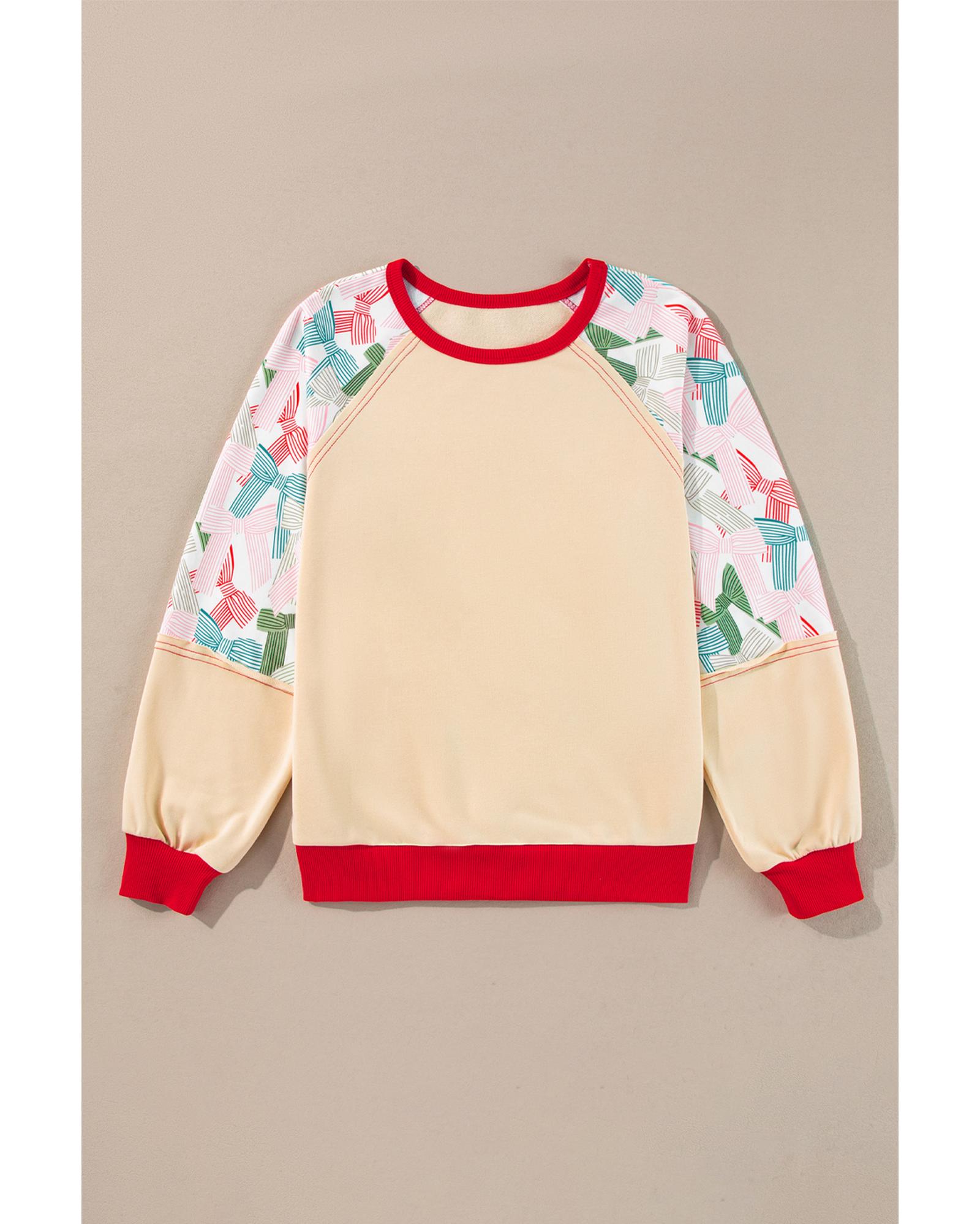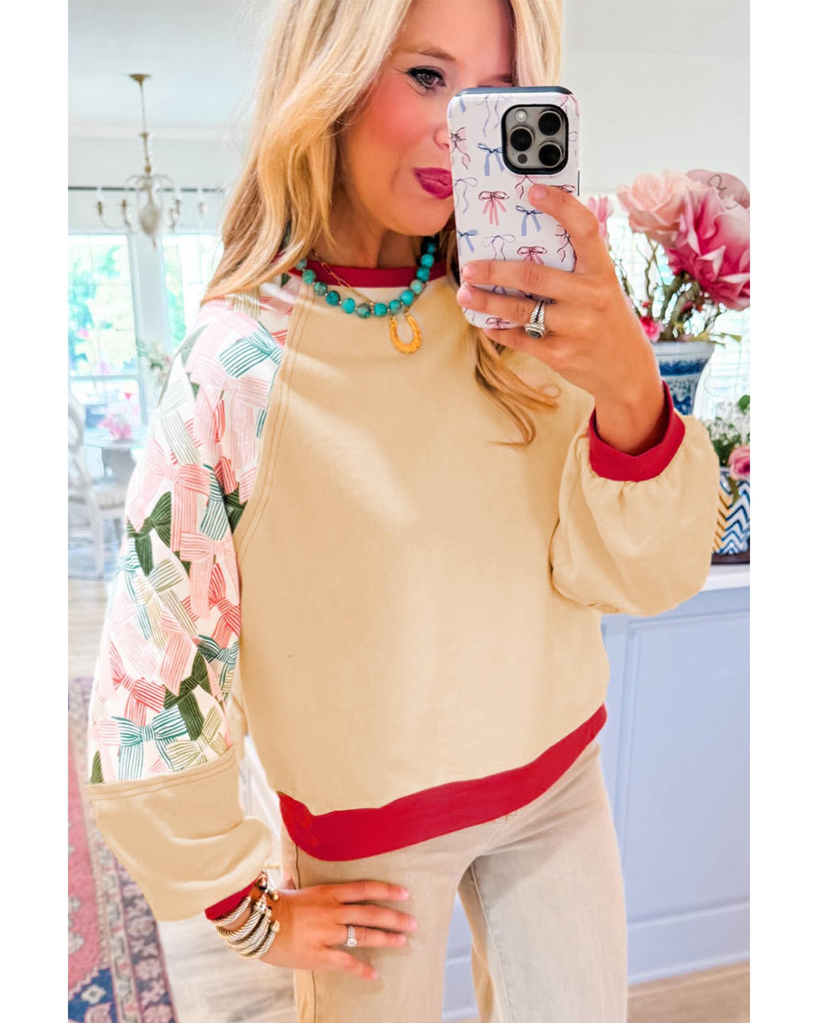 Beige Bowknot Printed Patchwork Raglan Sleeve Colorblock Edge Top – M