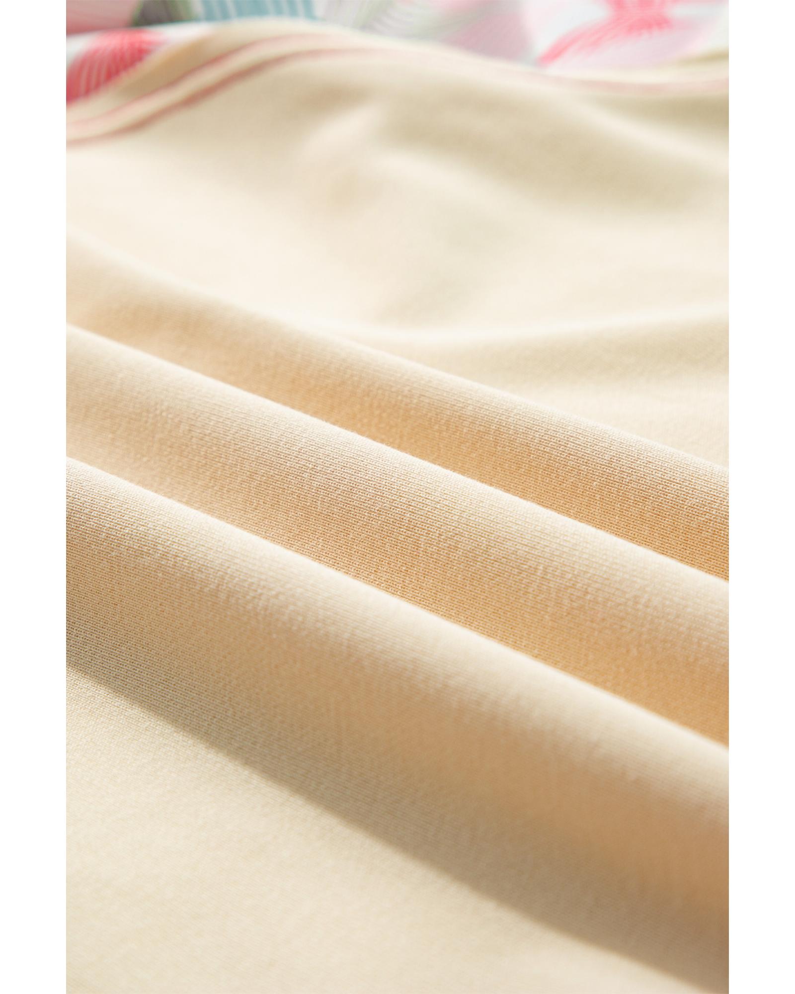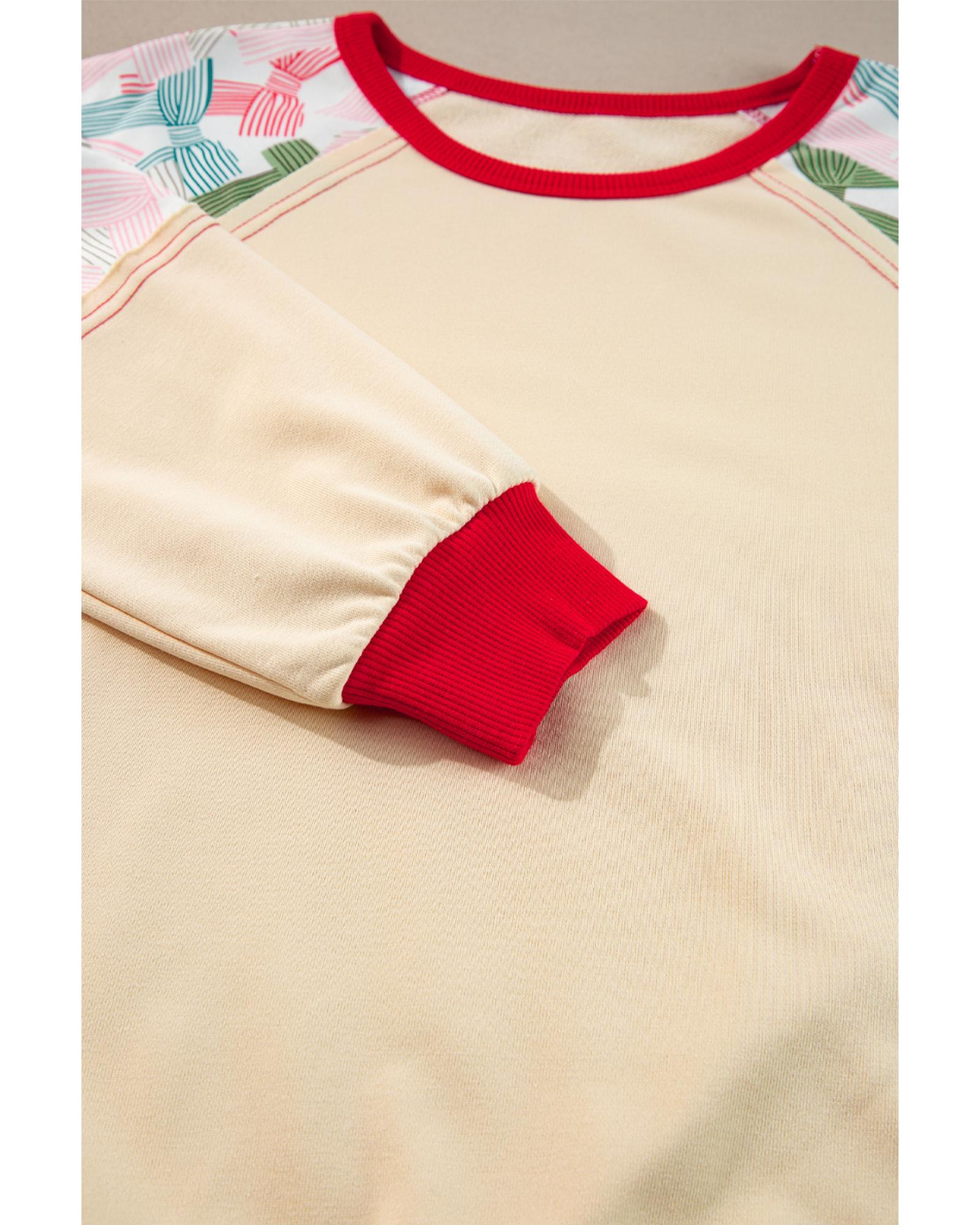 Beige Bowknot Printed Patchwork Raglan Sleeve Colorblock Edge Top – S