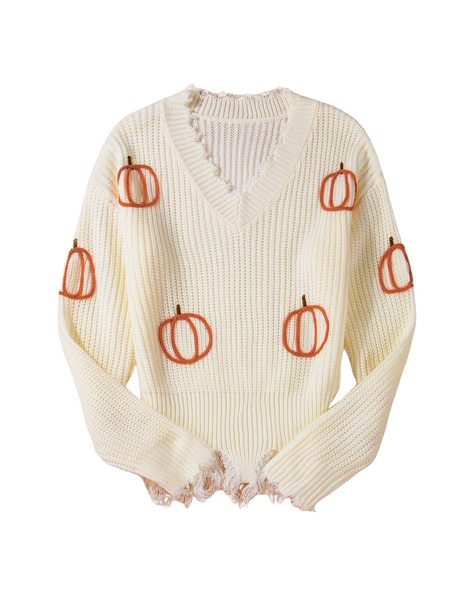 Beige Cable Knit Pumpkin Raw Hem V Neck Loose Sweater – L