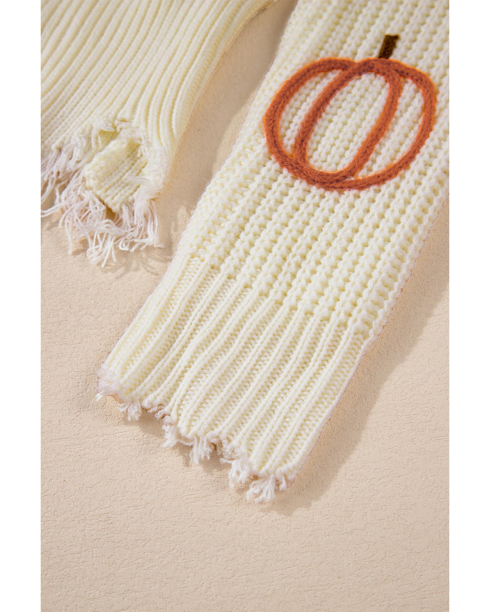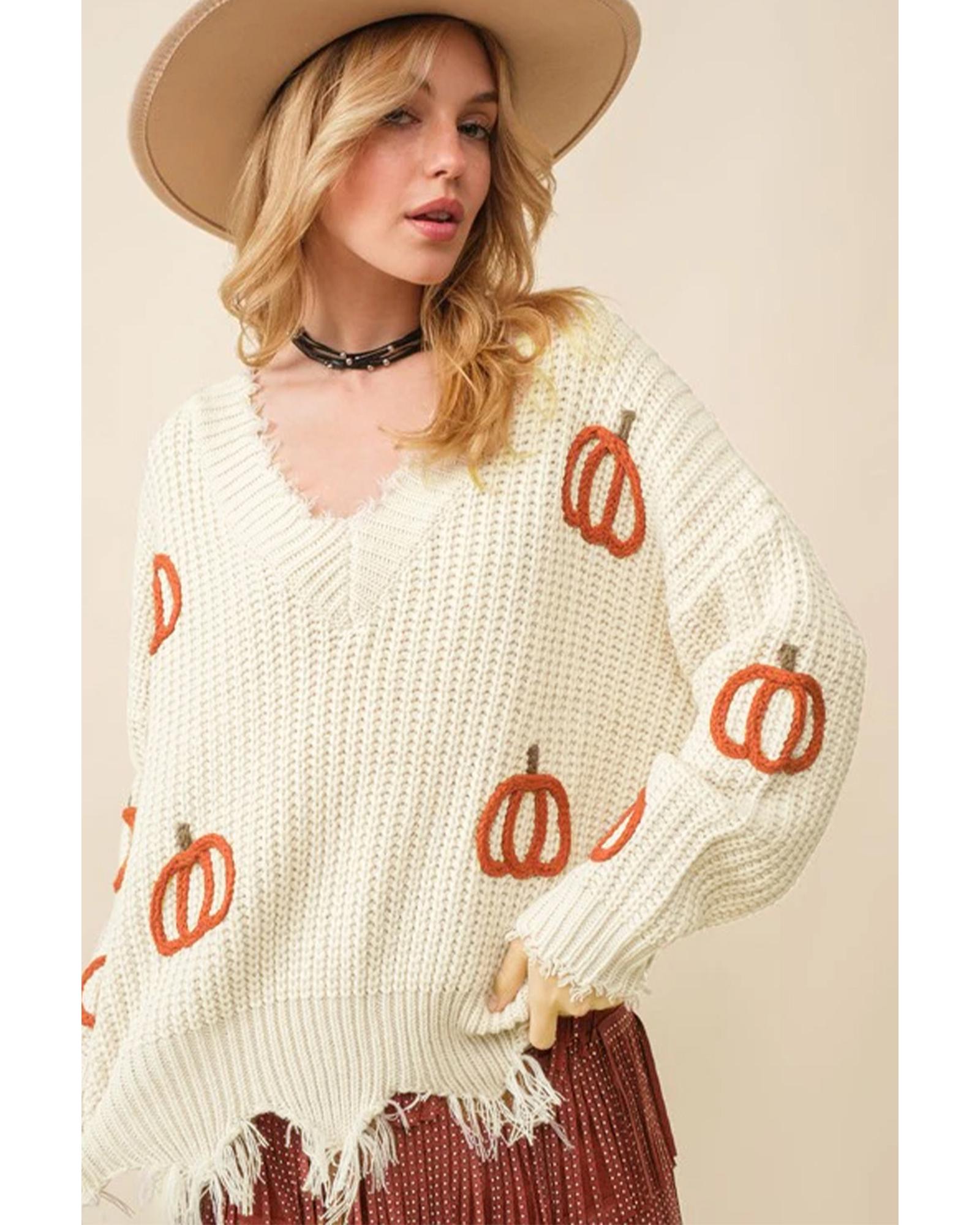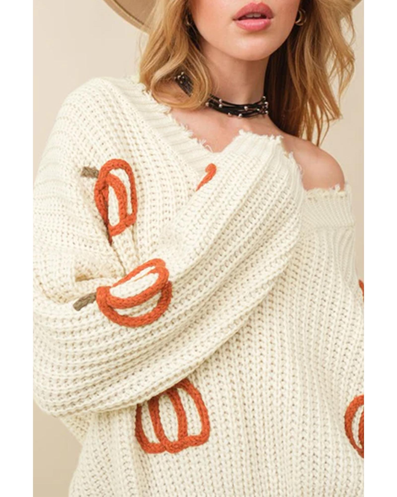 Beige Cable Knit Pumpkin Raw Hem V Neck Loose Sweater – XL