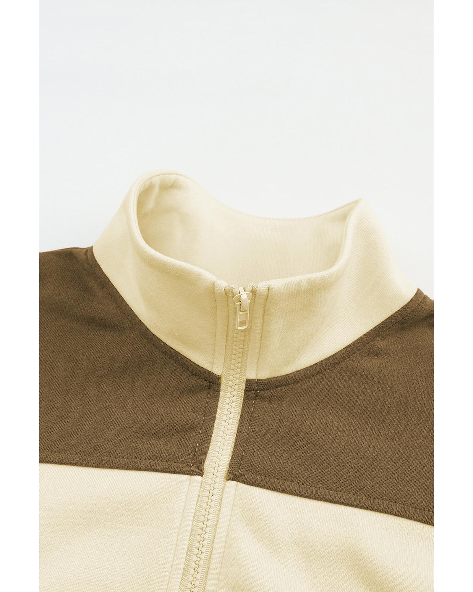 Beige Color Block Drawstring Cropped Athleisure Jacket – S