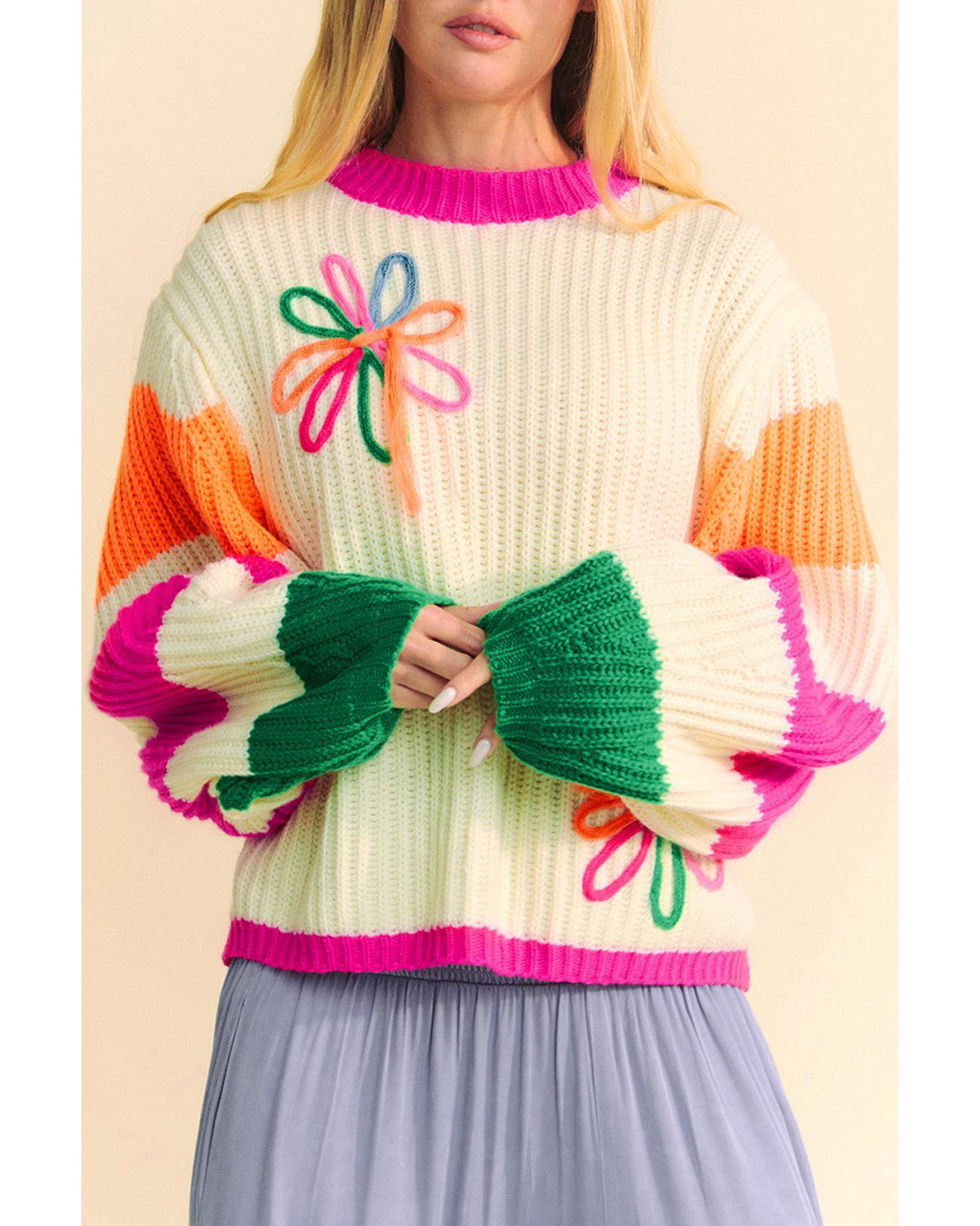 Beige Colorblock Flower Print Cable Knit Loose Sweater – XL