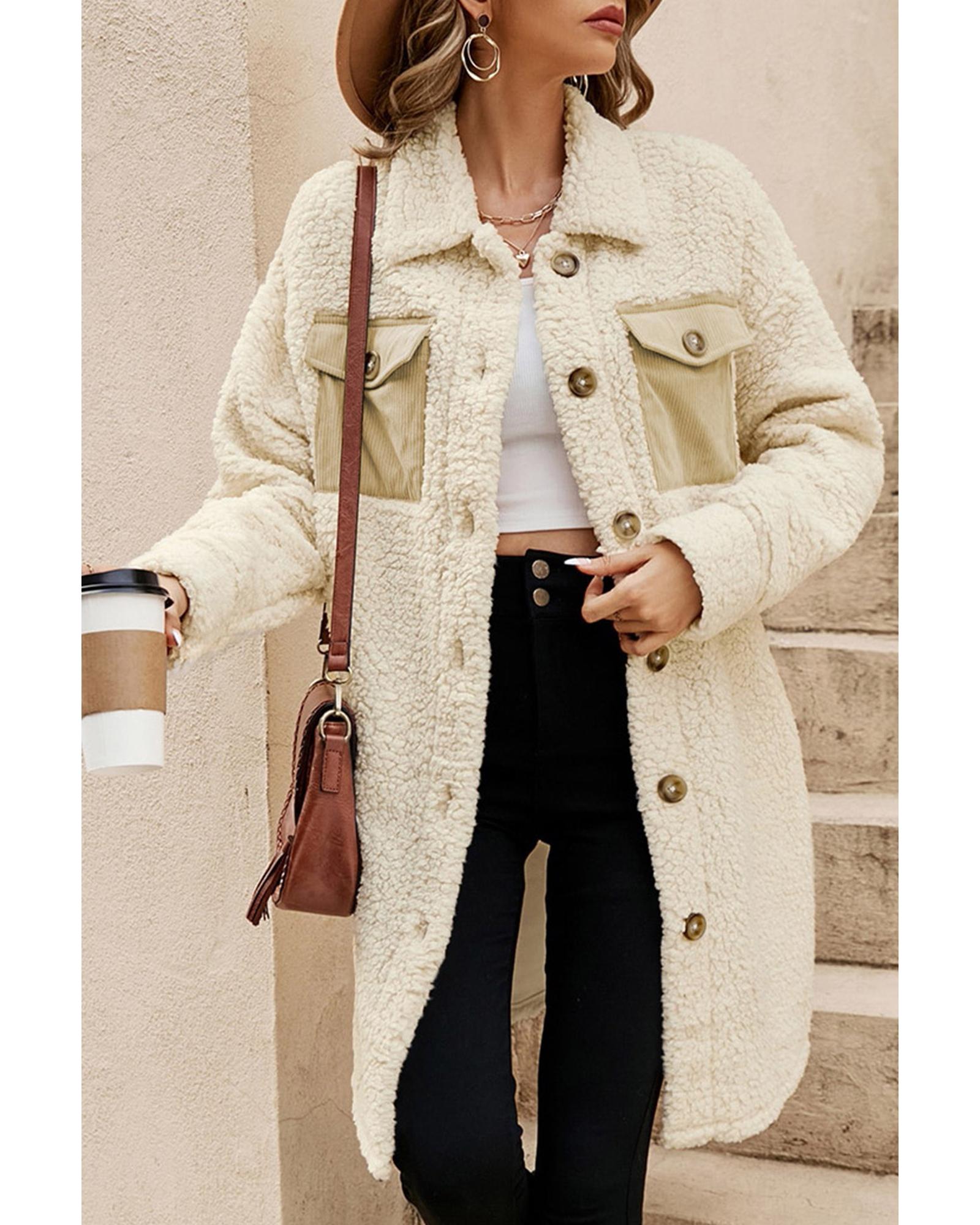 • Beige Contrast Flap Pocket Single Breasted Teddy Coat