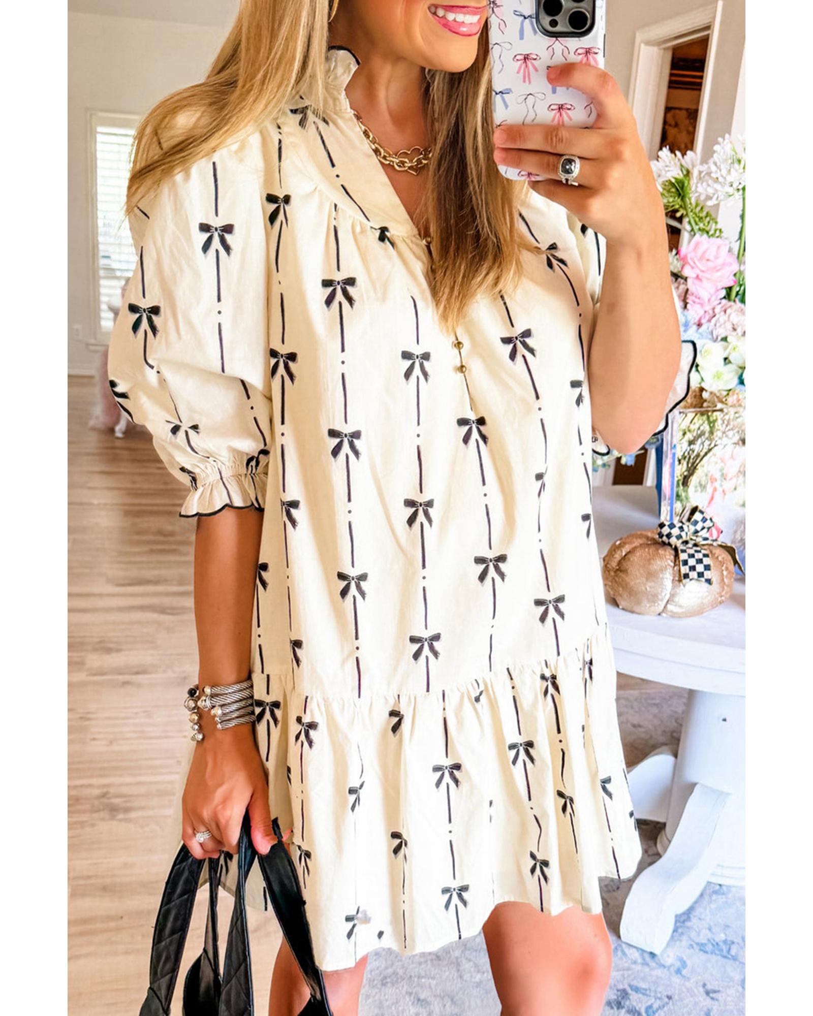 Beige Cute Bowknot Printed Bubble Sleeve V Neck Mini Dress – M