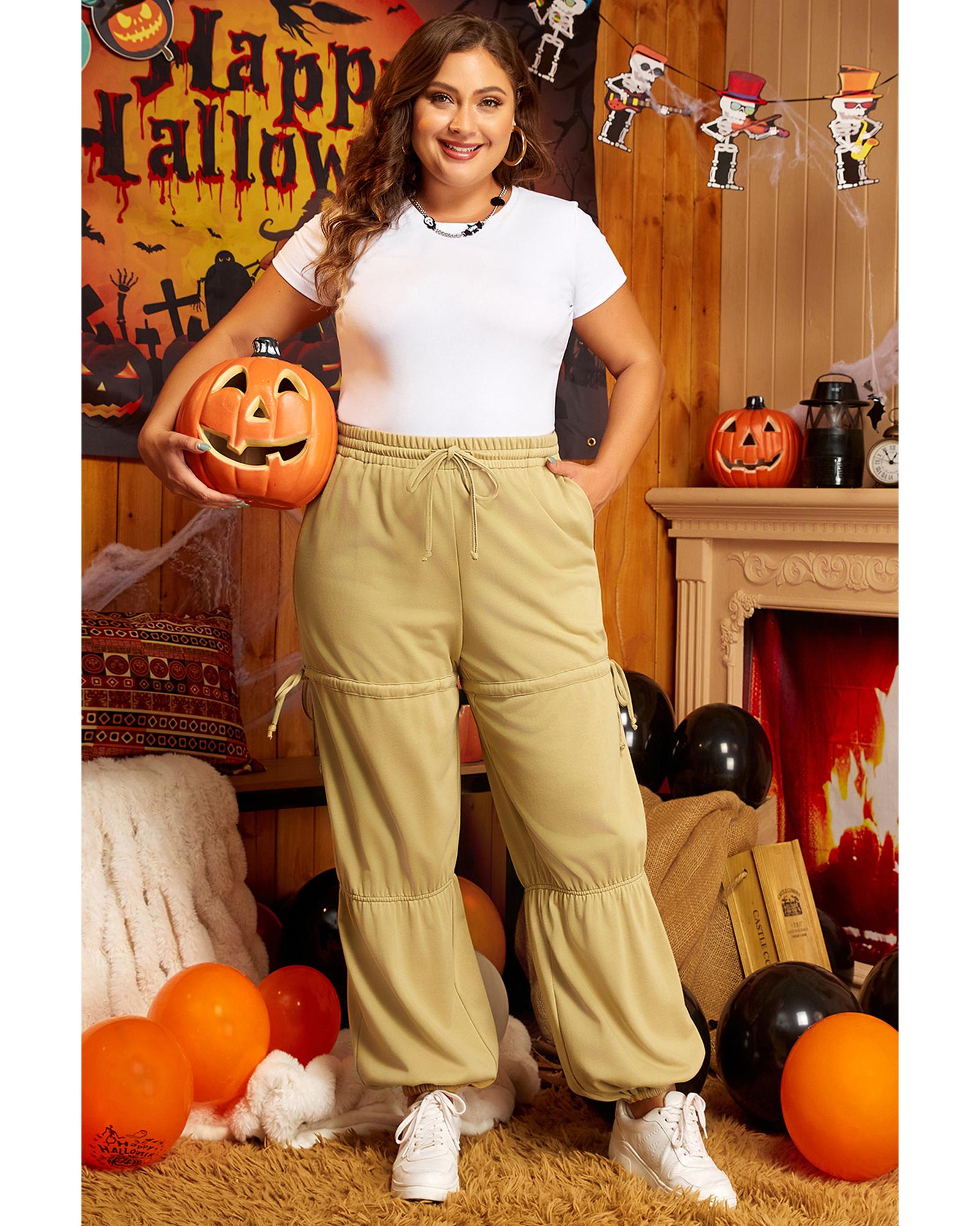 Beige Drawstring Adjusted Band High Waist Plus Size Pants – 4X