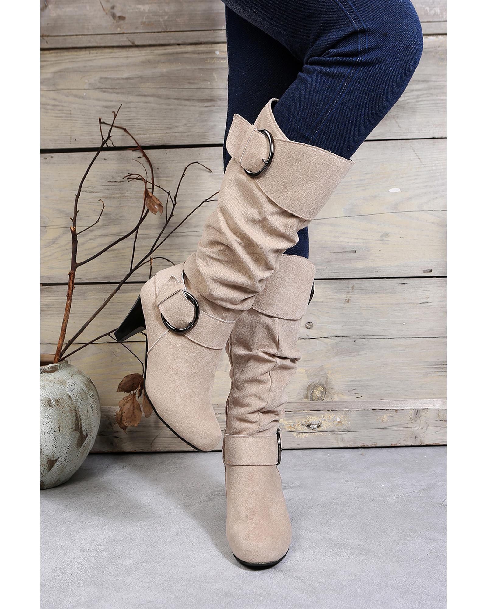 Beige Dual Buckle Strap Side Zip Heeled Mid Calf Boots – 42 EU