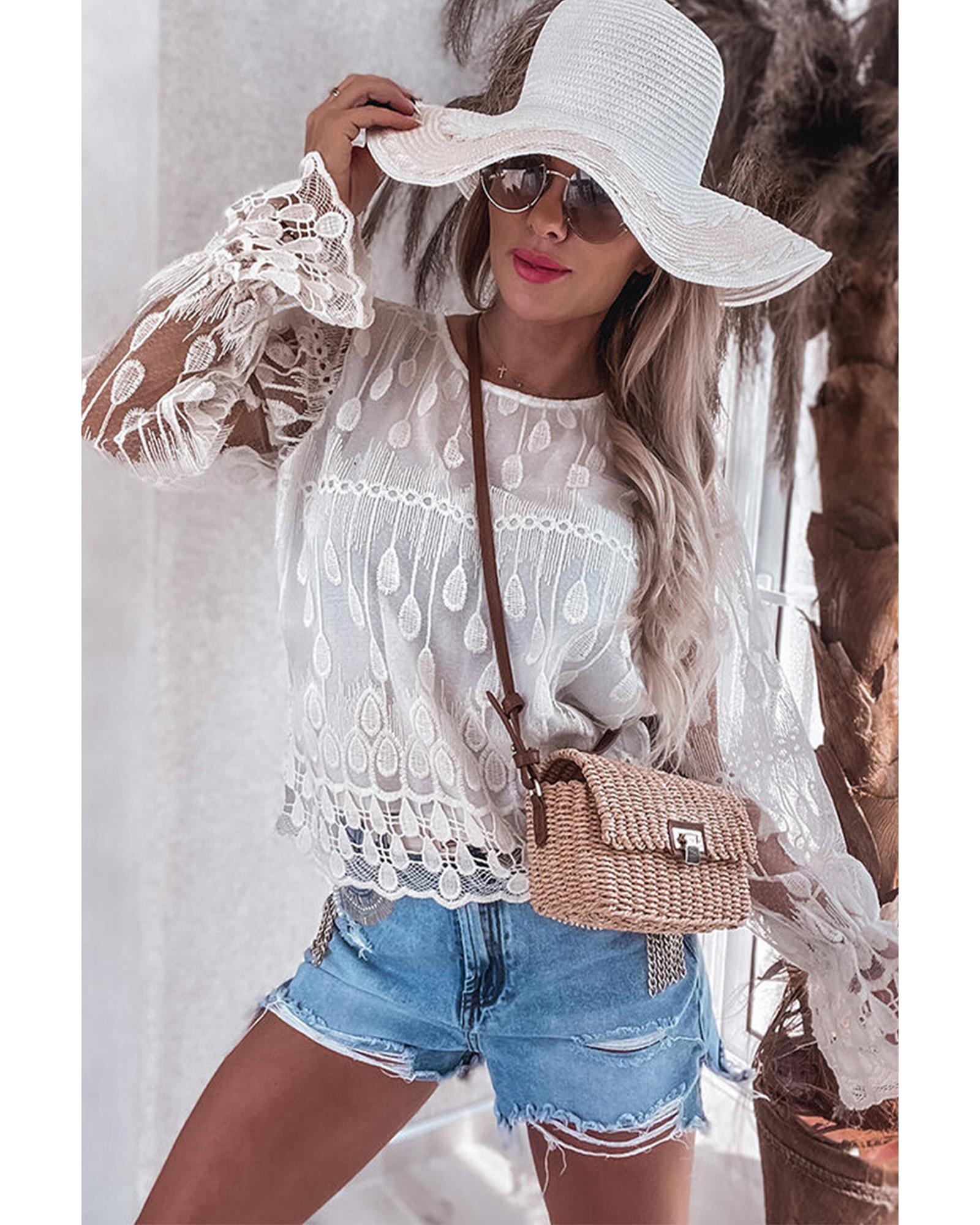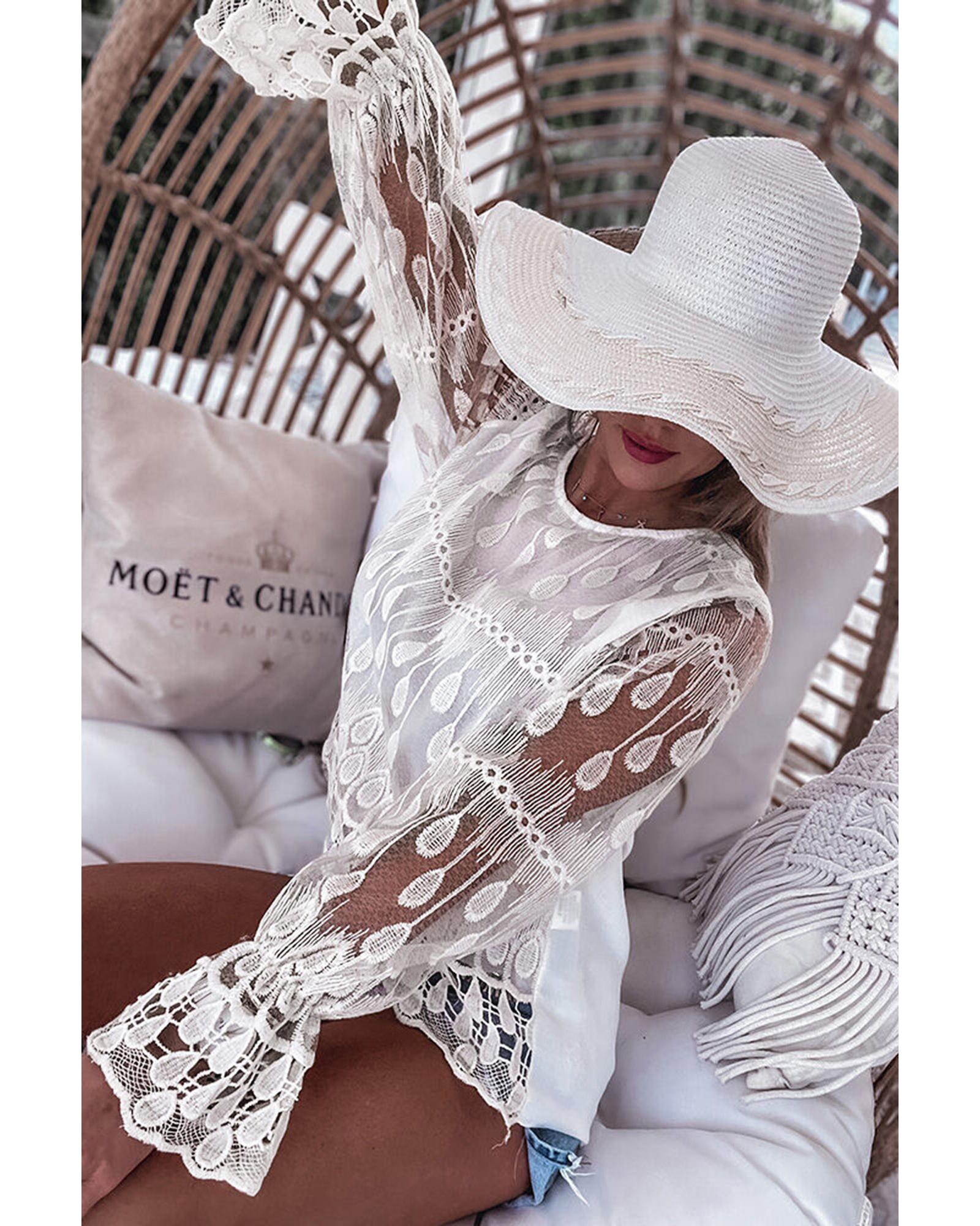 Beige Embroidered Mesh Flounce Sleeve Blouse – L