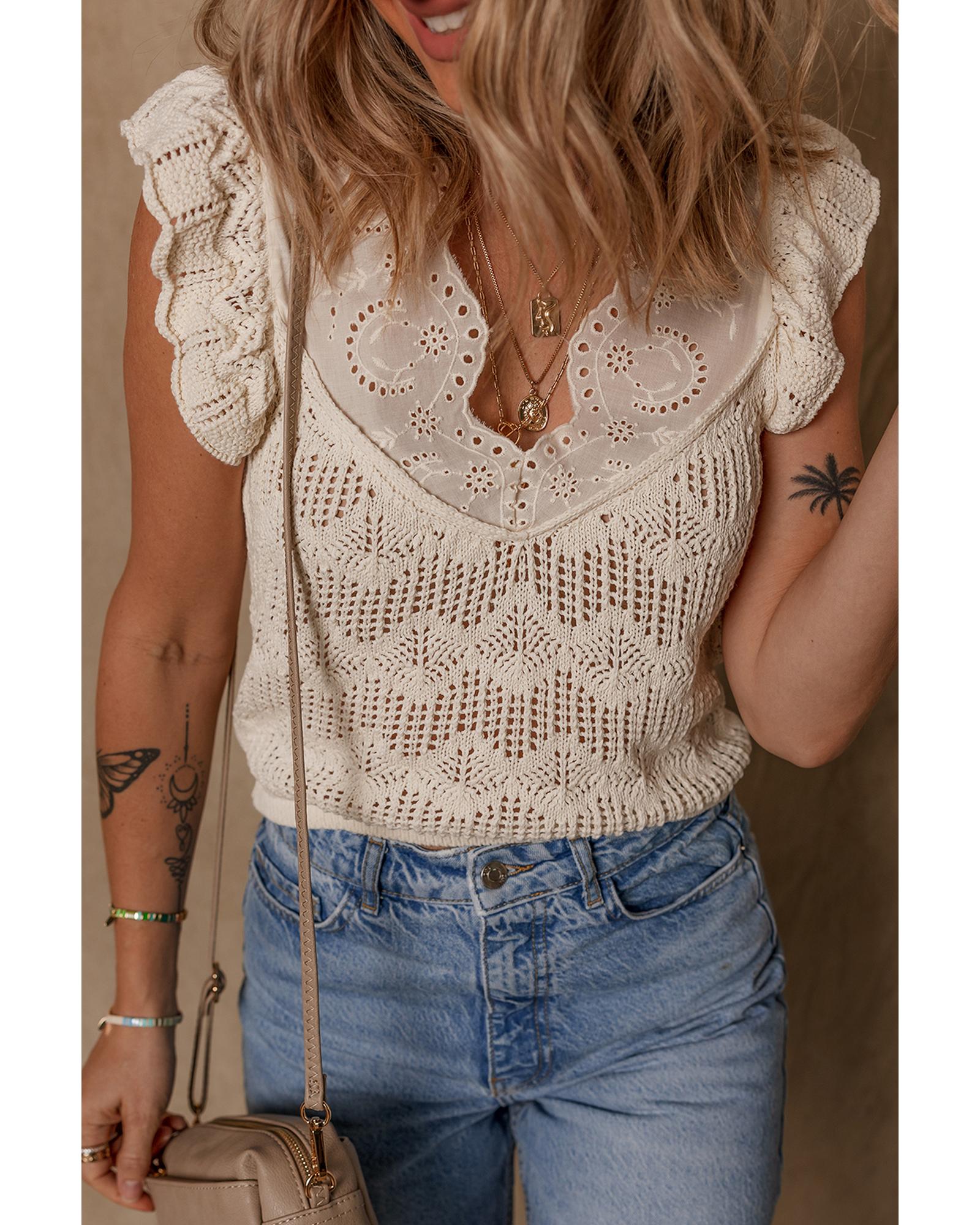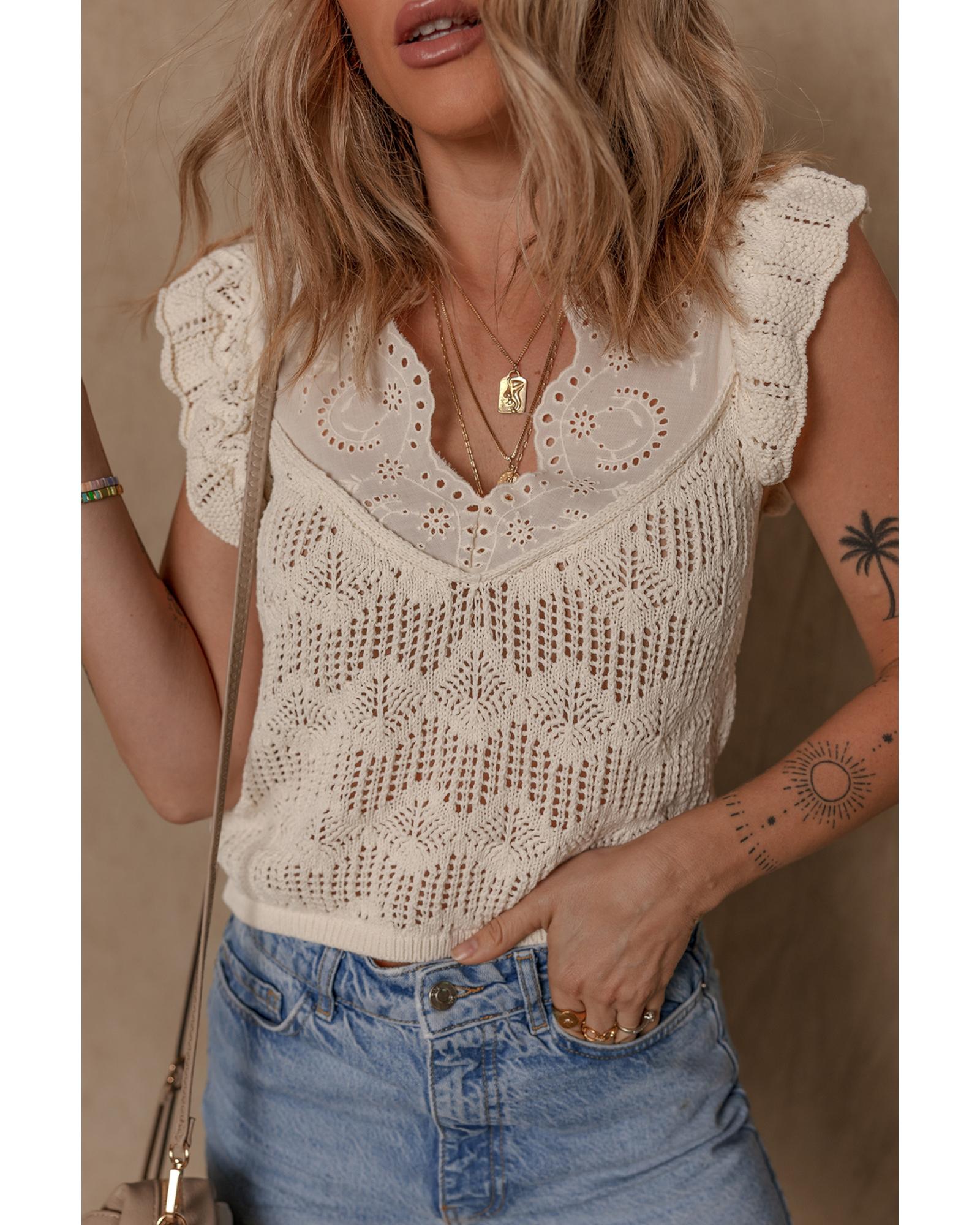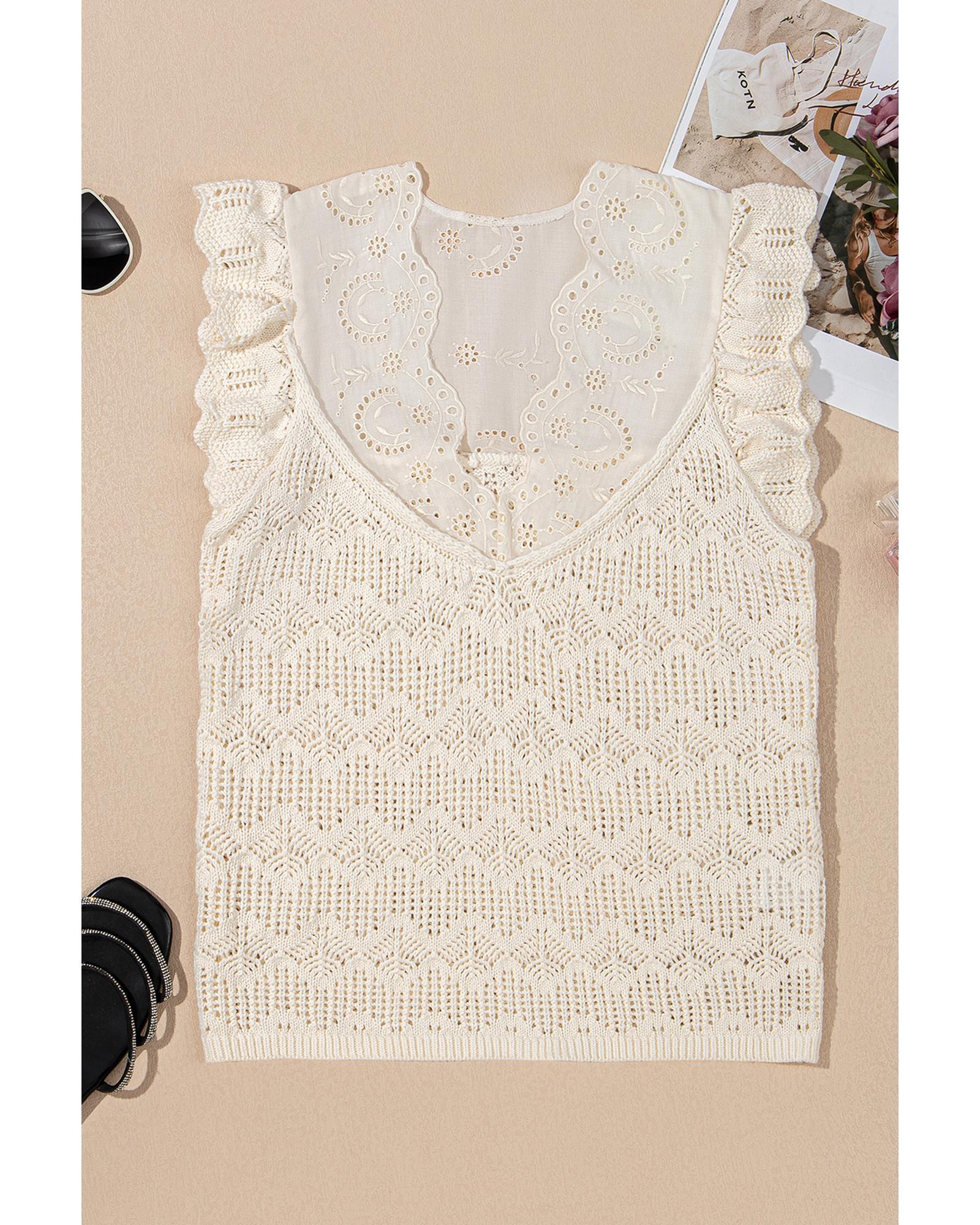 - Beige embroidered patchwork hollow out knitted ruffle sweater vest