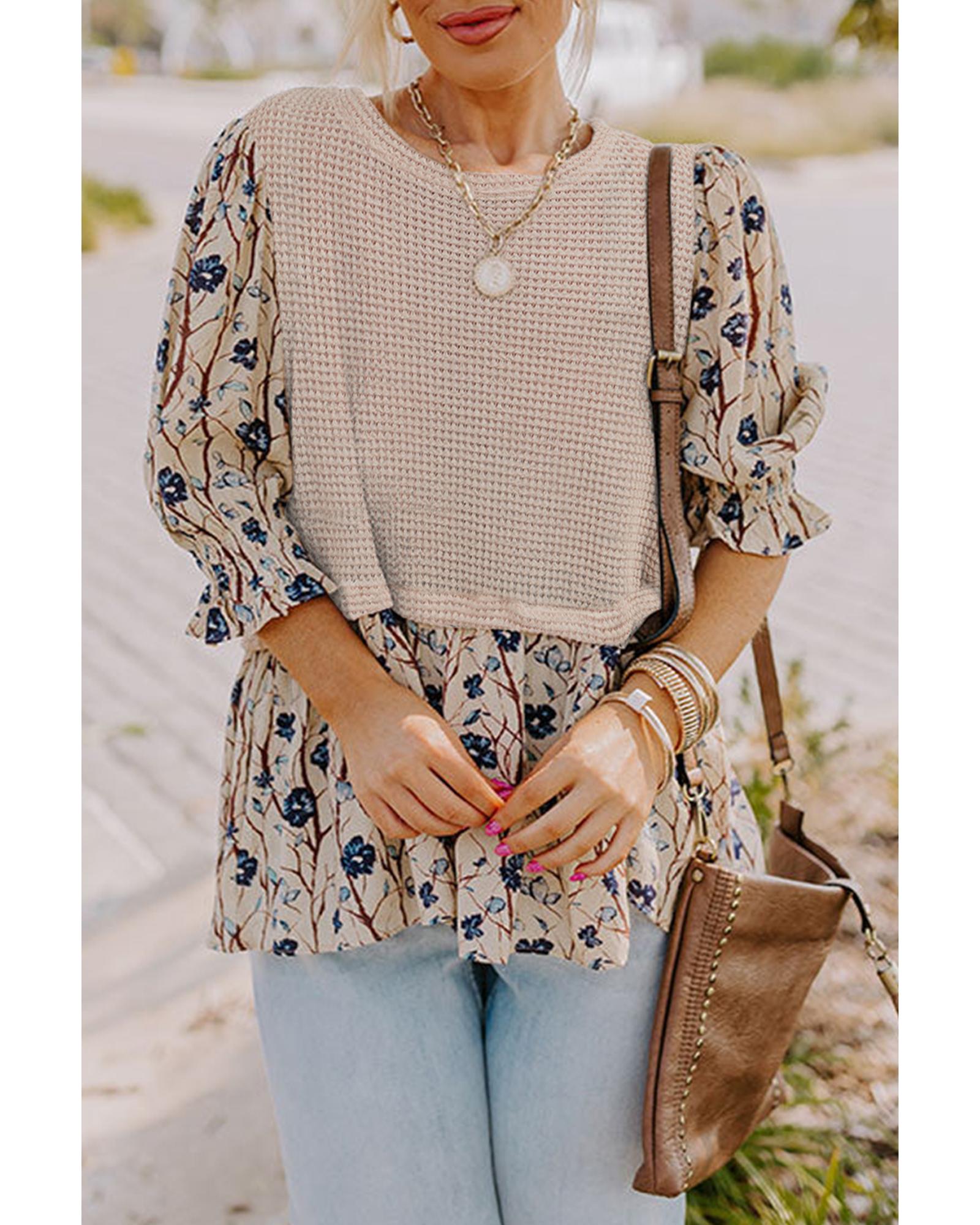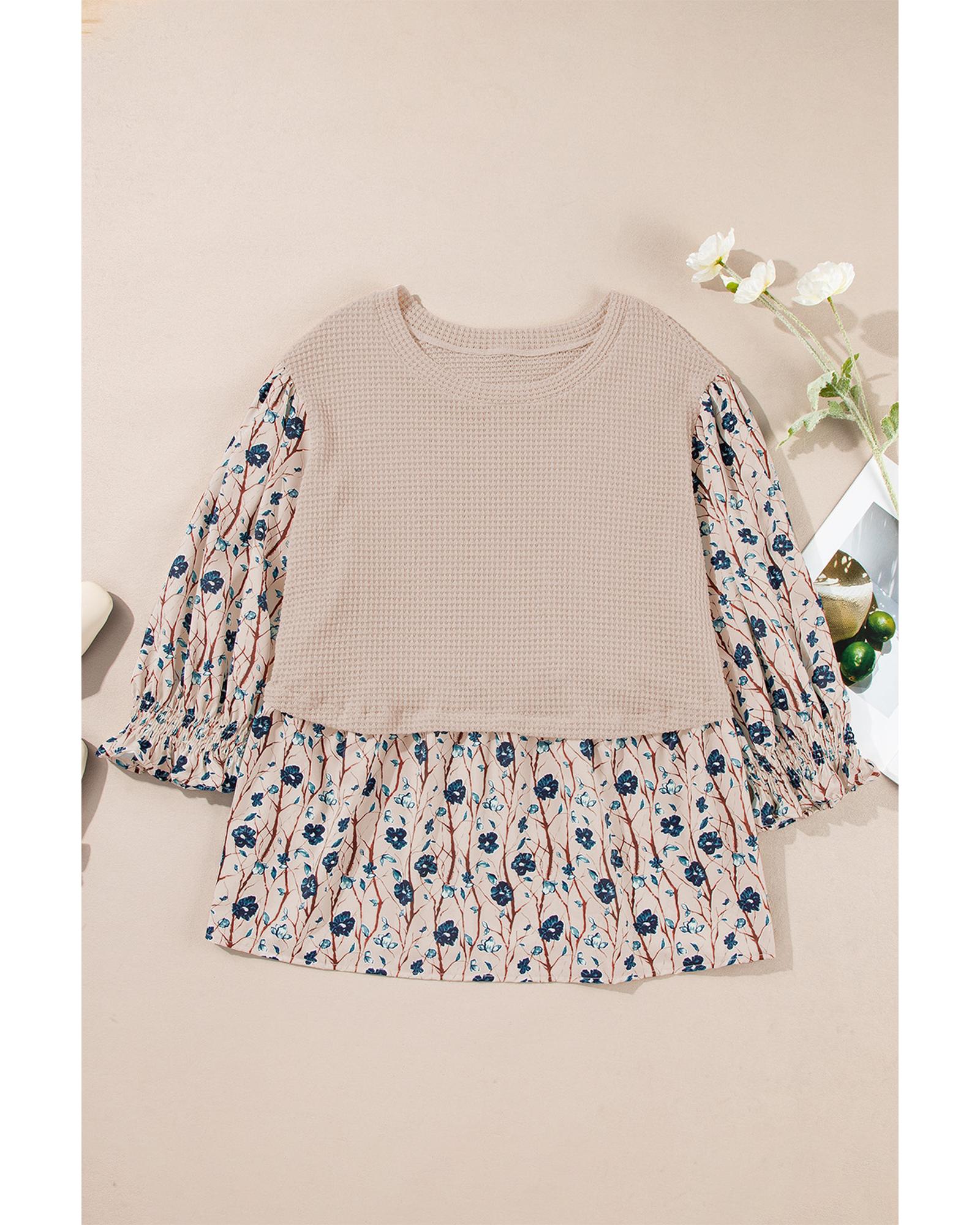 Beige Faux Two Piece Knit Patchwork Floral Print Plus Size Top - 1X