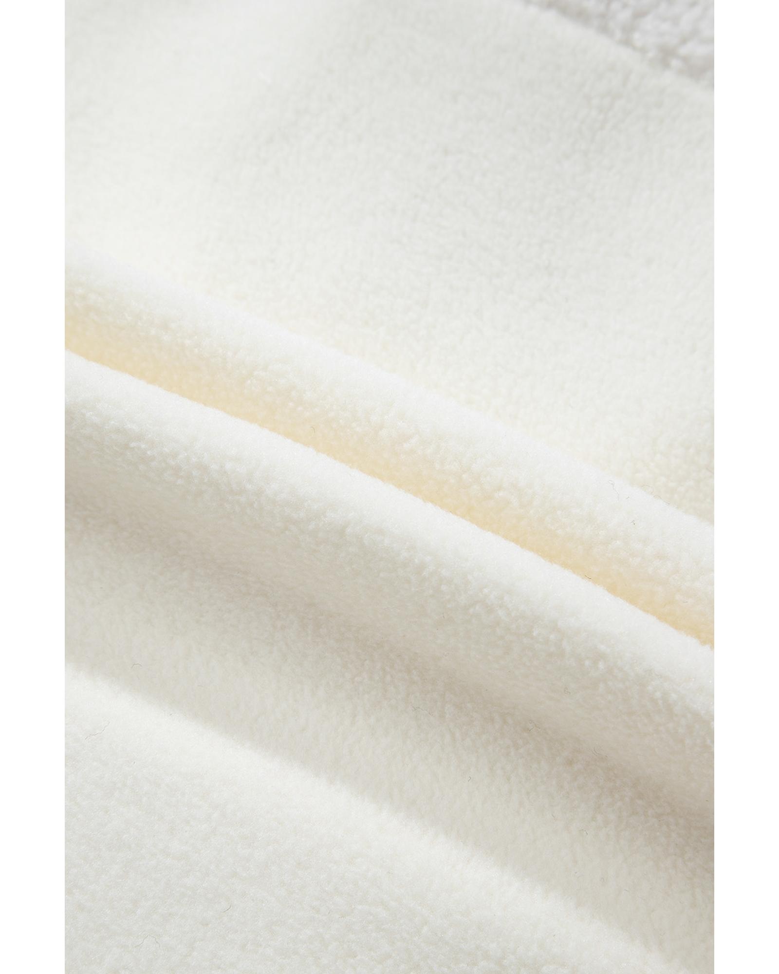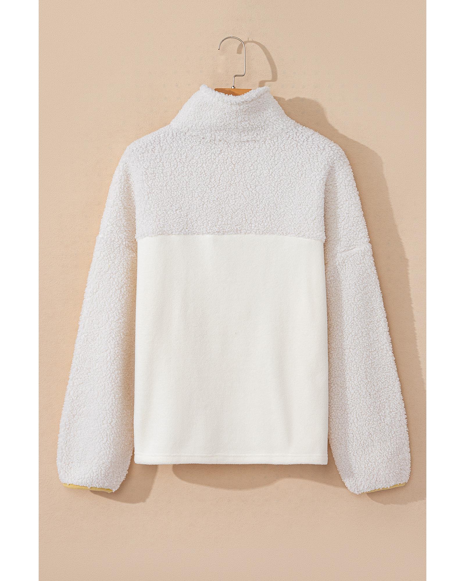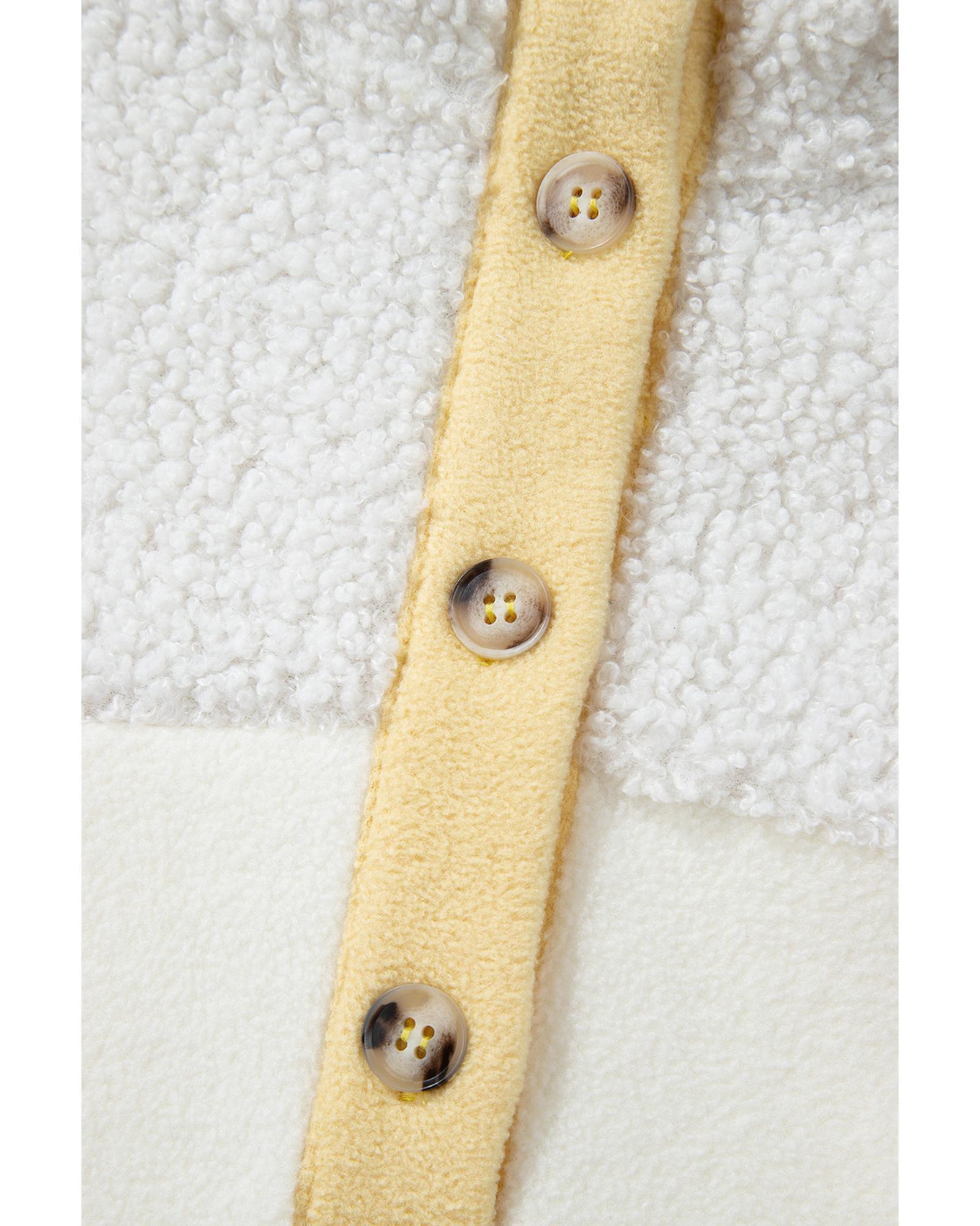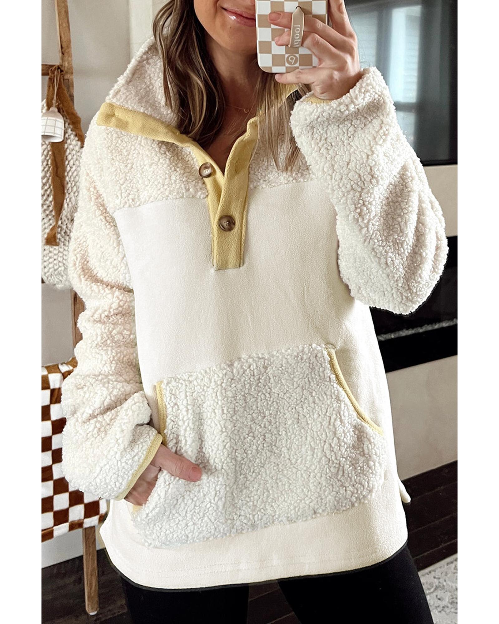 Beige Fleece Colorblock Trim Buttons Collar Sweatshirt with Pocket – S