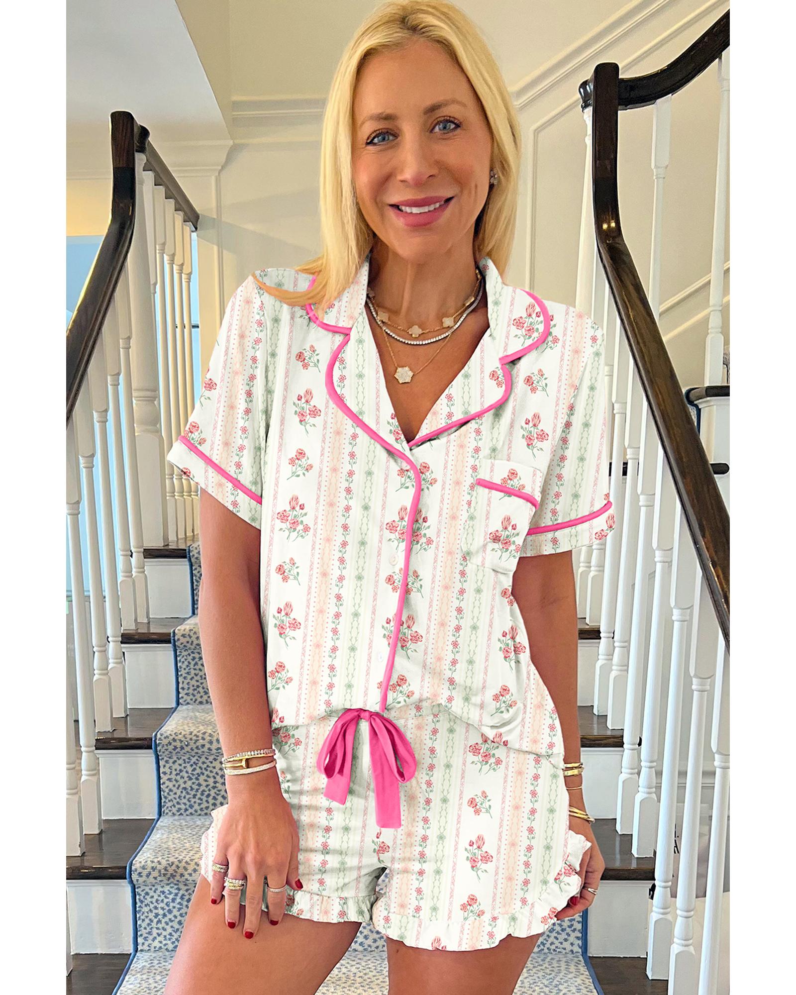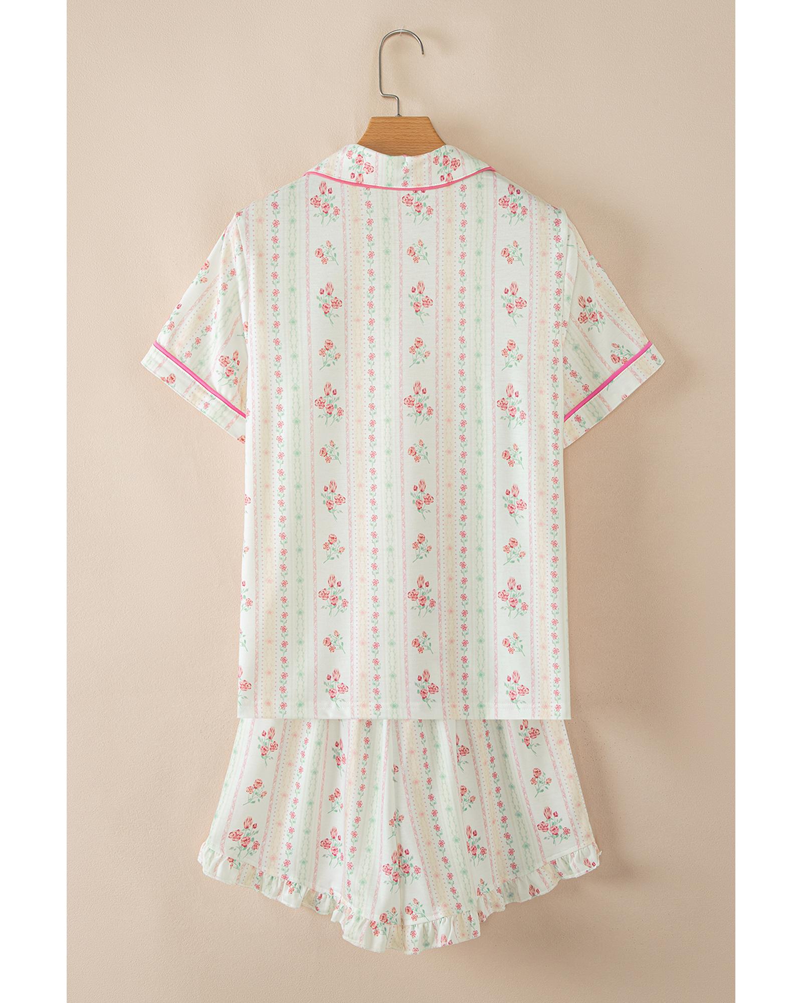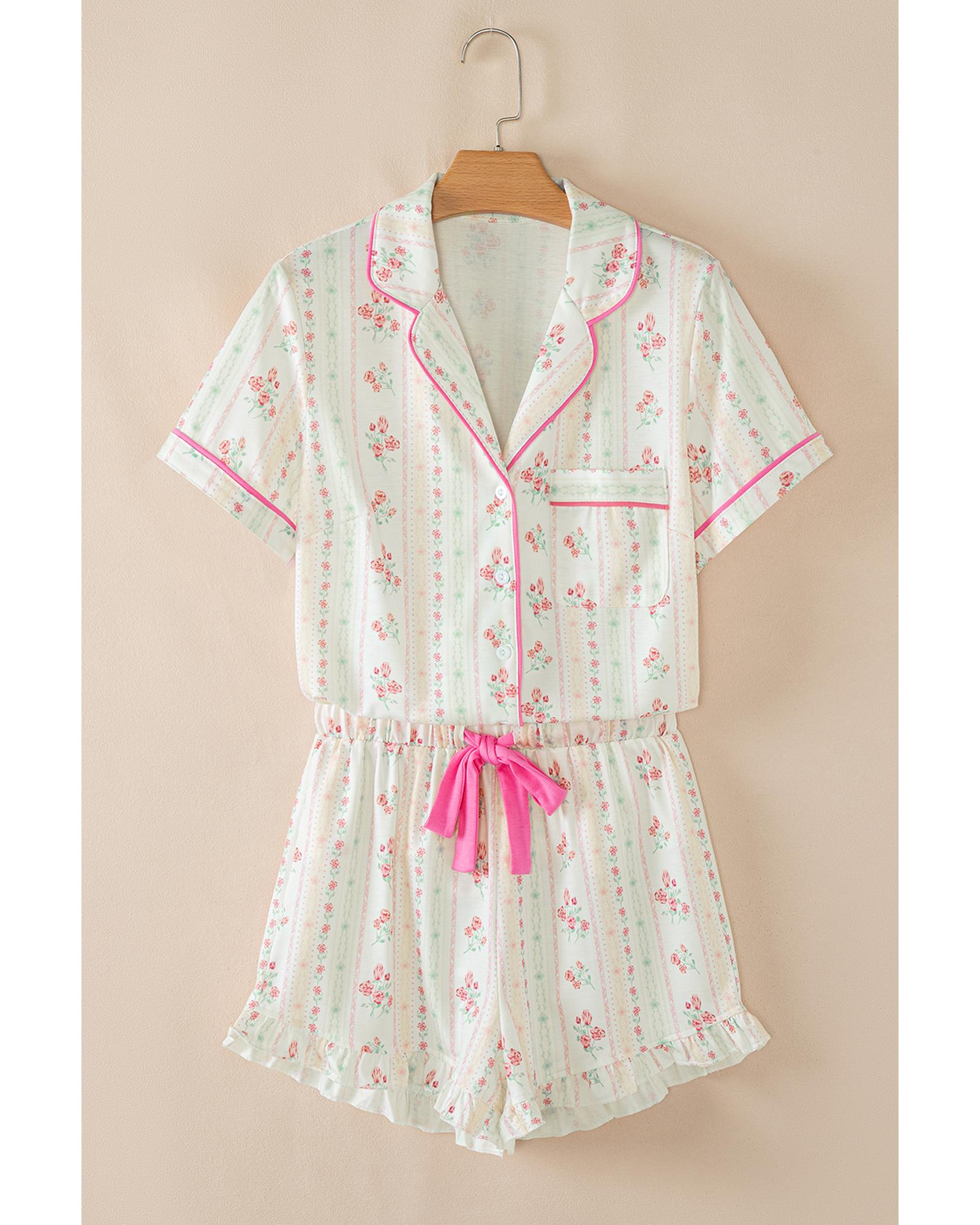 - Beige Floral Print Contrast Piping Short Pajamas Set