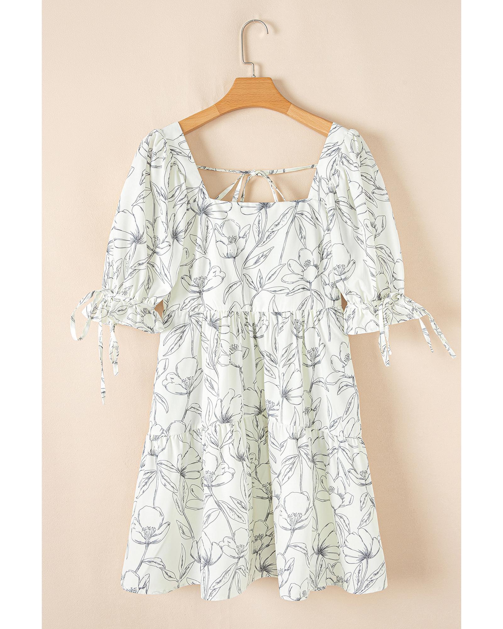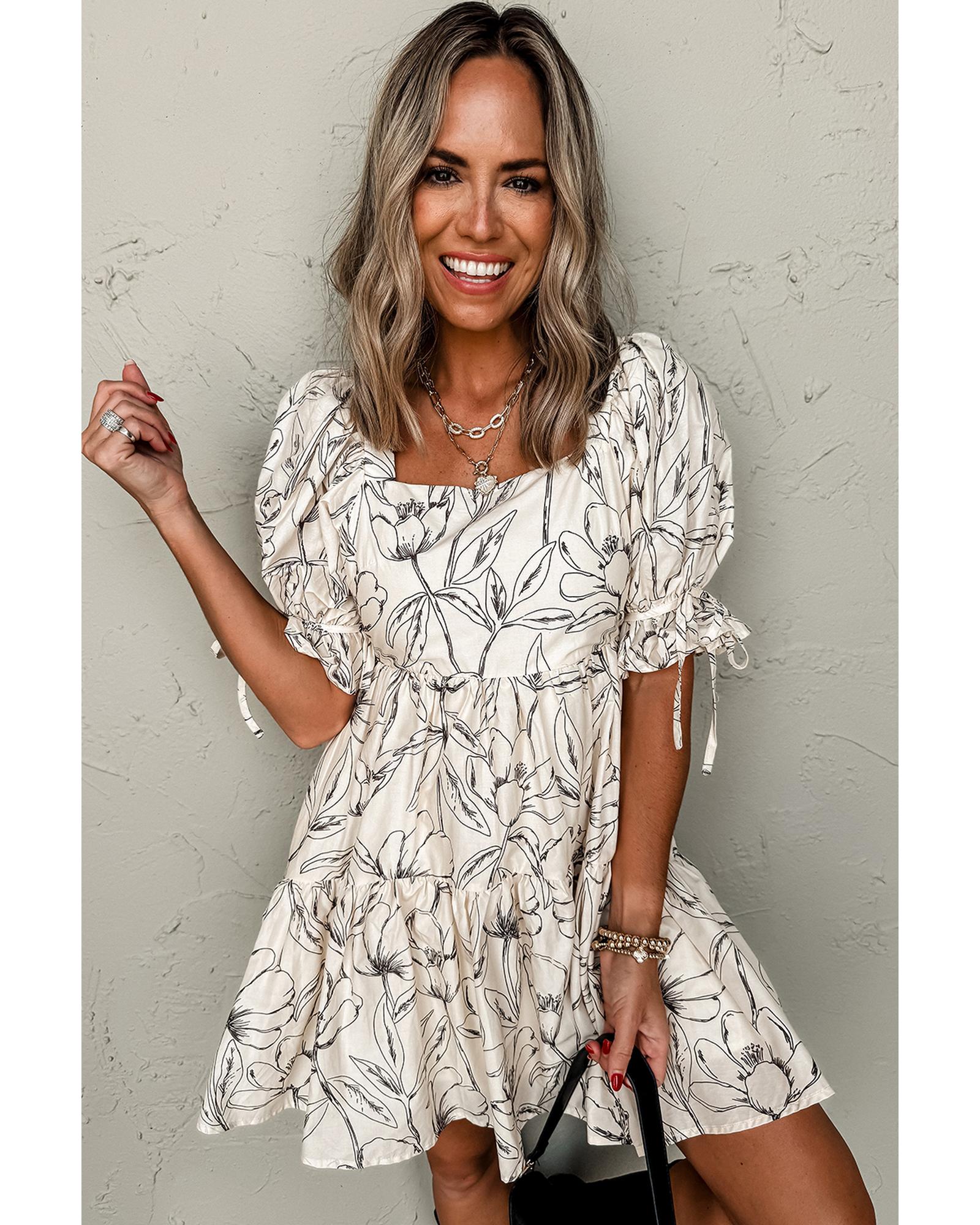 Beige Floral Print Square Neck Shirred Back Puff Sleeve Mini Dress – L