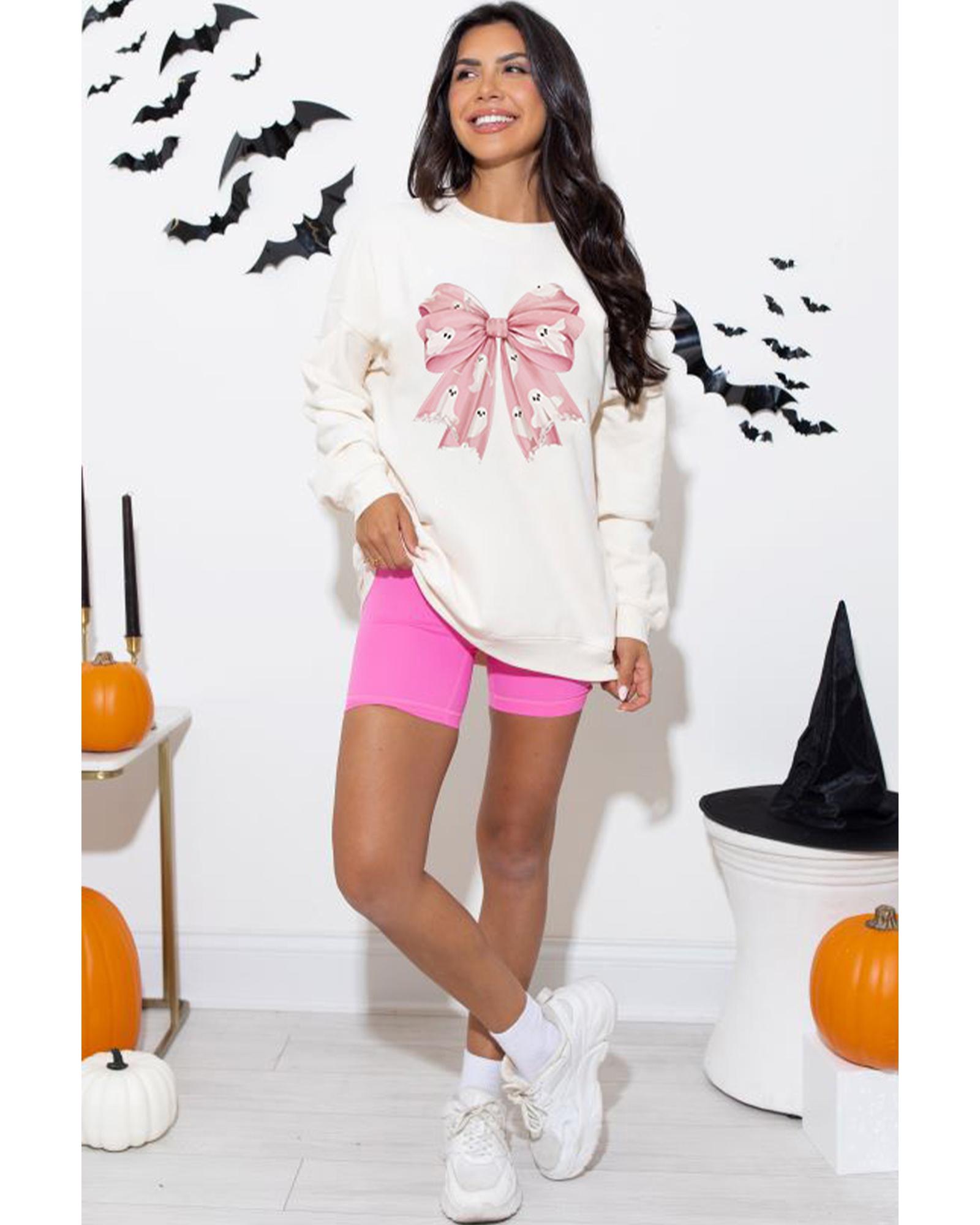 - Beige Ghost Bowknot Graphic Crew Neck Drop Shoulder Sweatshirt