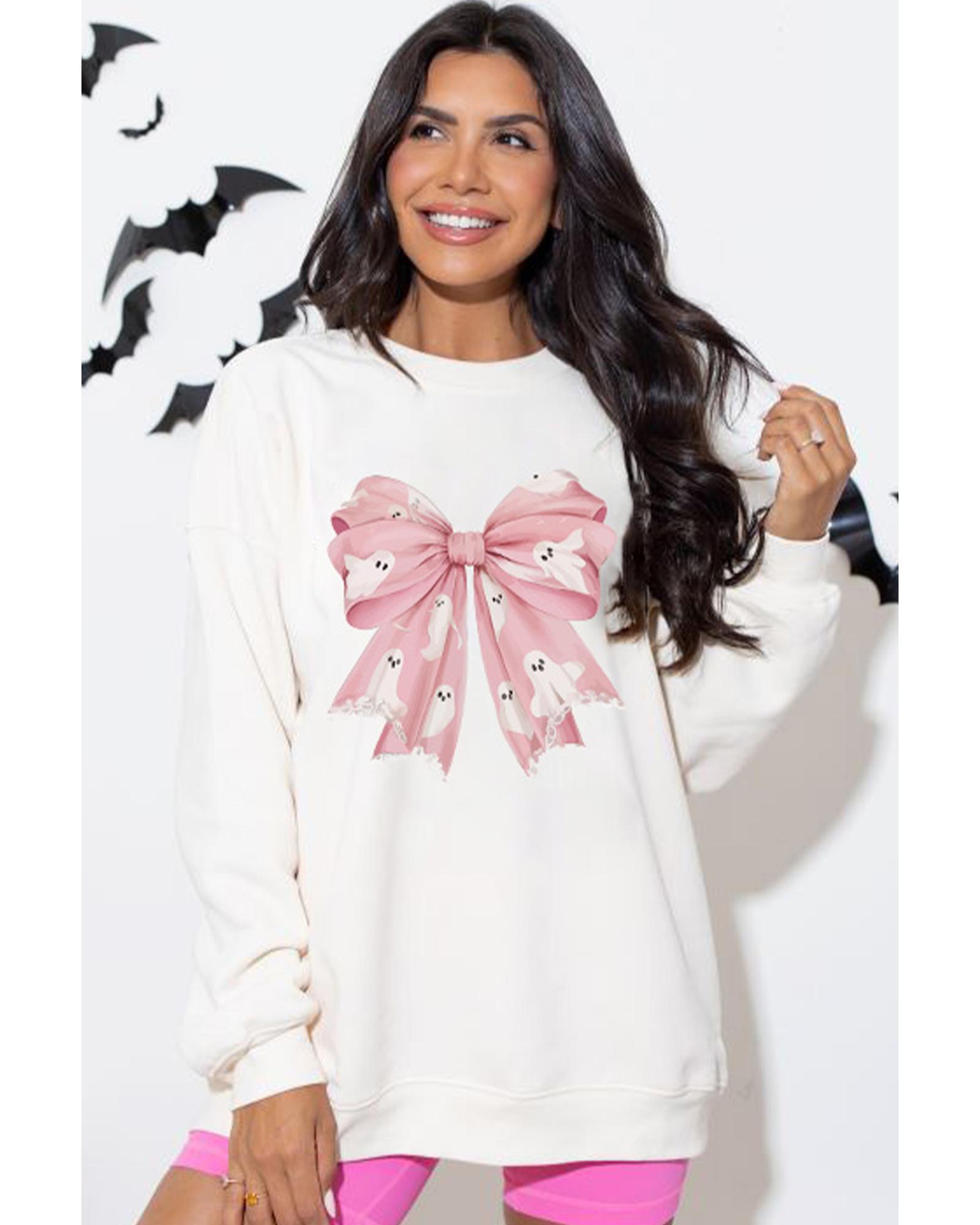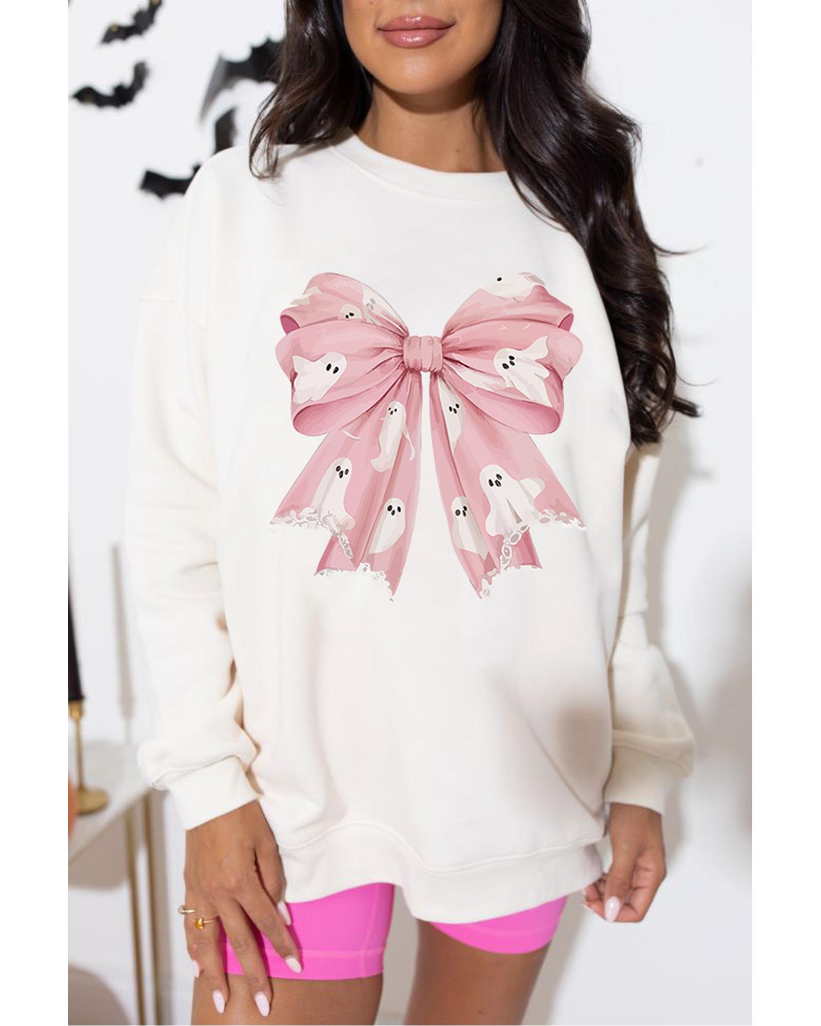 - Beige Ghost Bowknot Graphic Crew Neck Drop Shoulder Sweatshirt