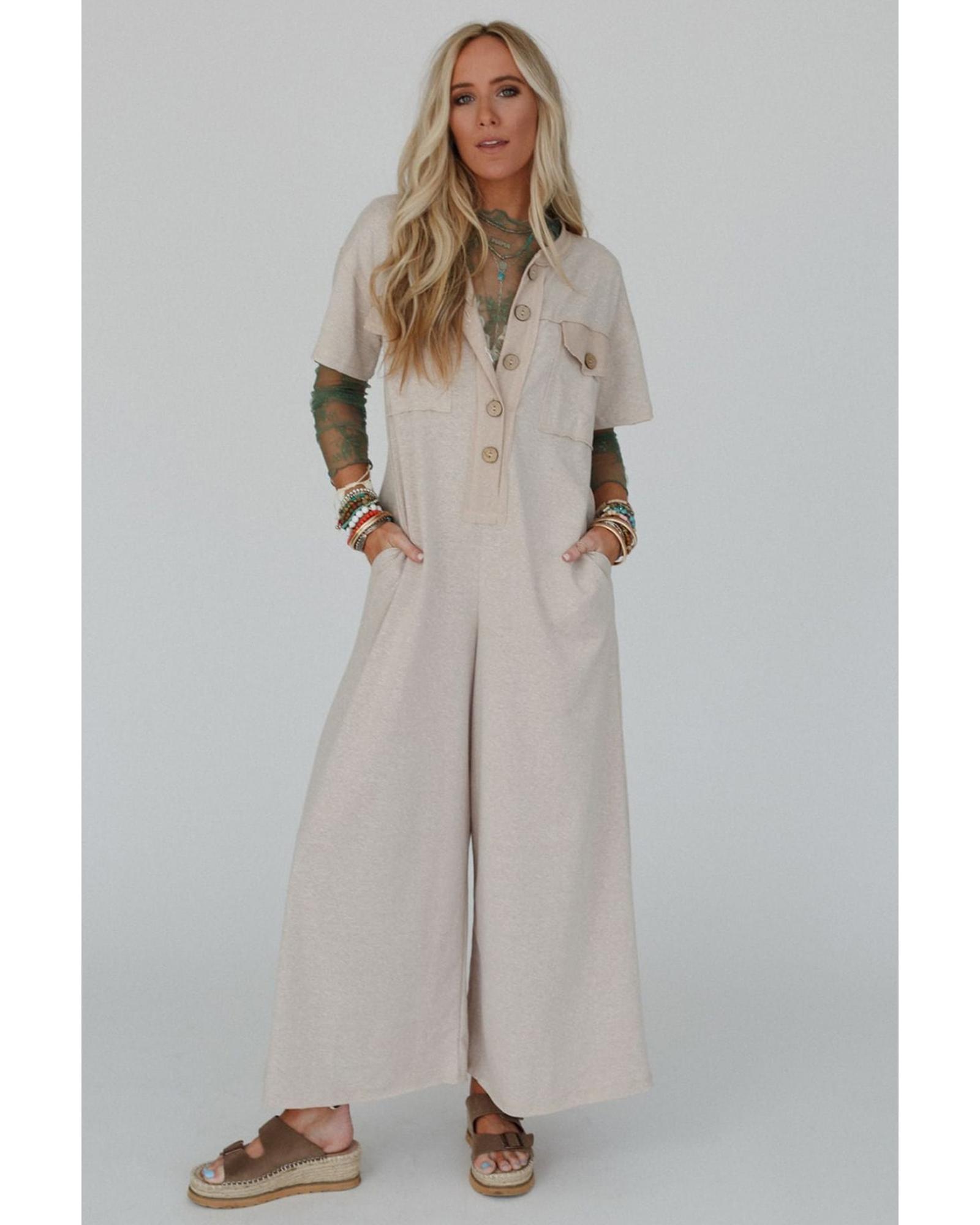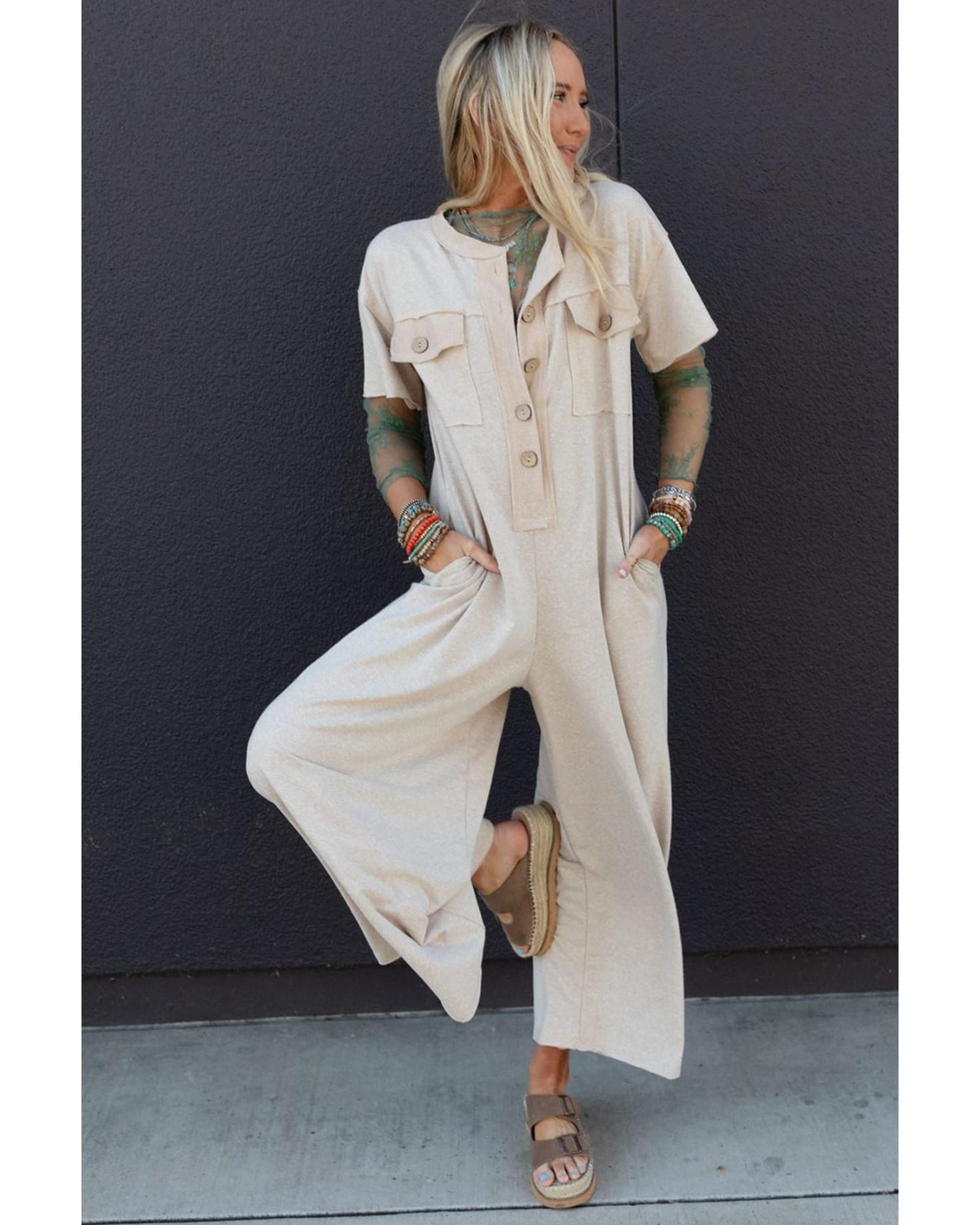 Beige Half Placket Chest Pockets Short Sleeve Wide Leg Jumpsuit – M