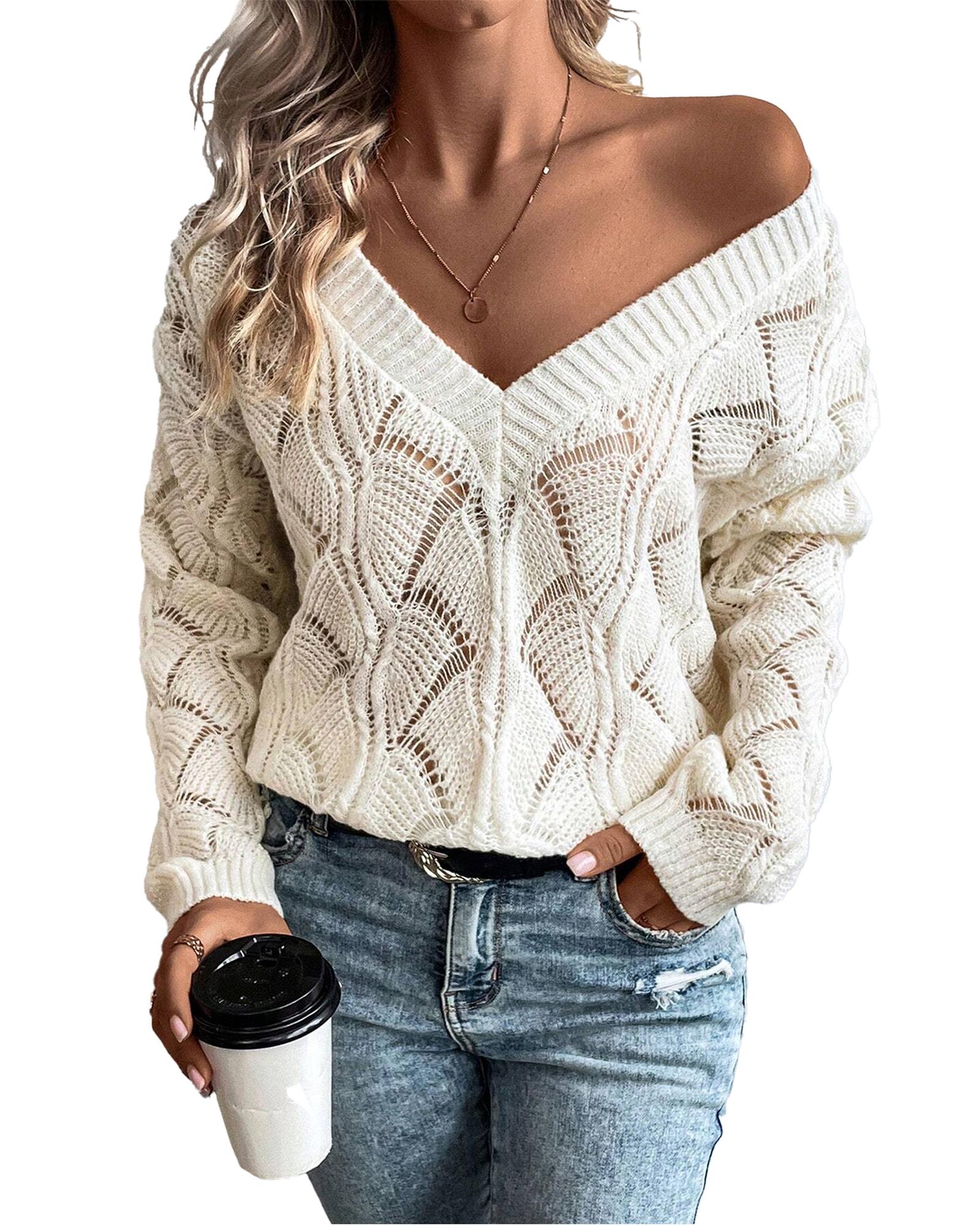 Beige Hollow Out Knit V Neck Drop Shoulder Sweater – S