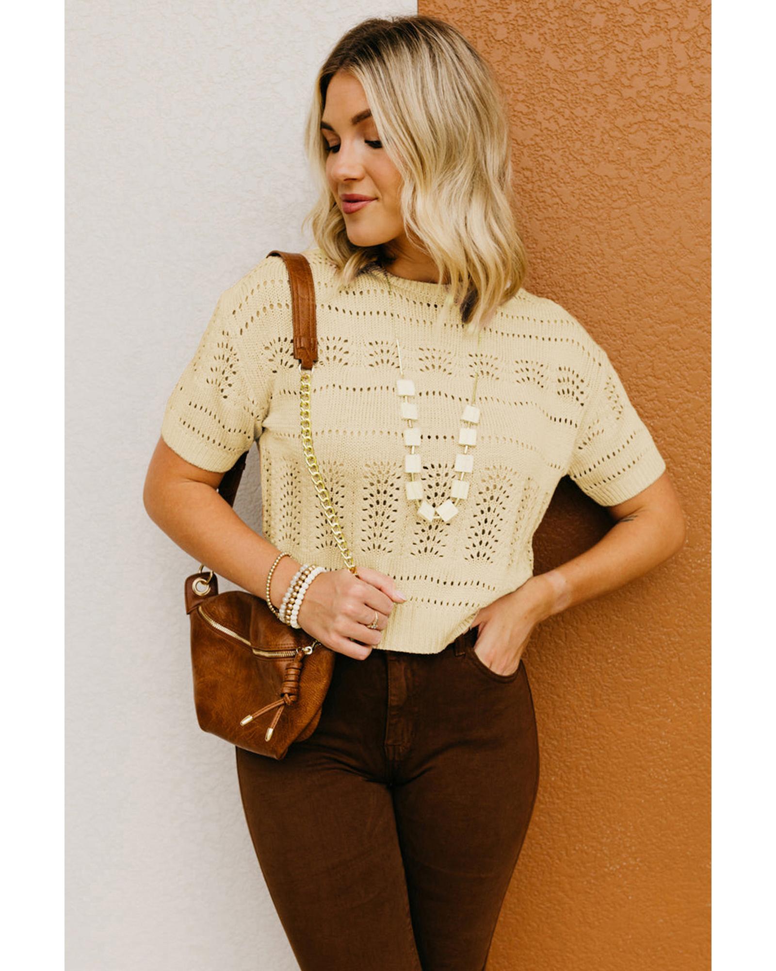 Beige Knitted Hollow out Short Sleeve Crop Sweater – L