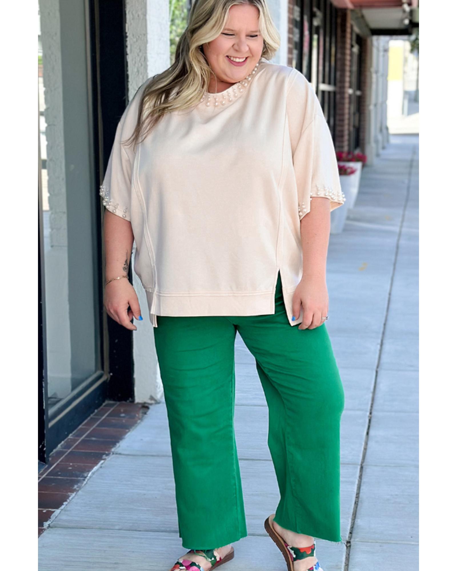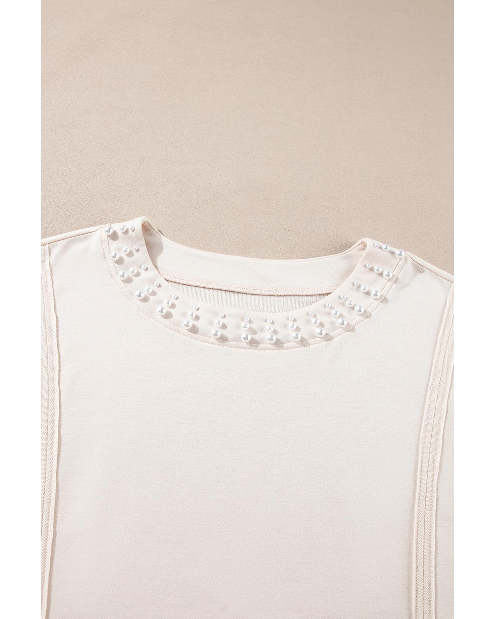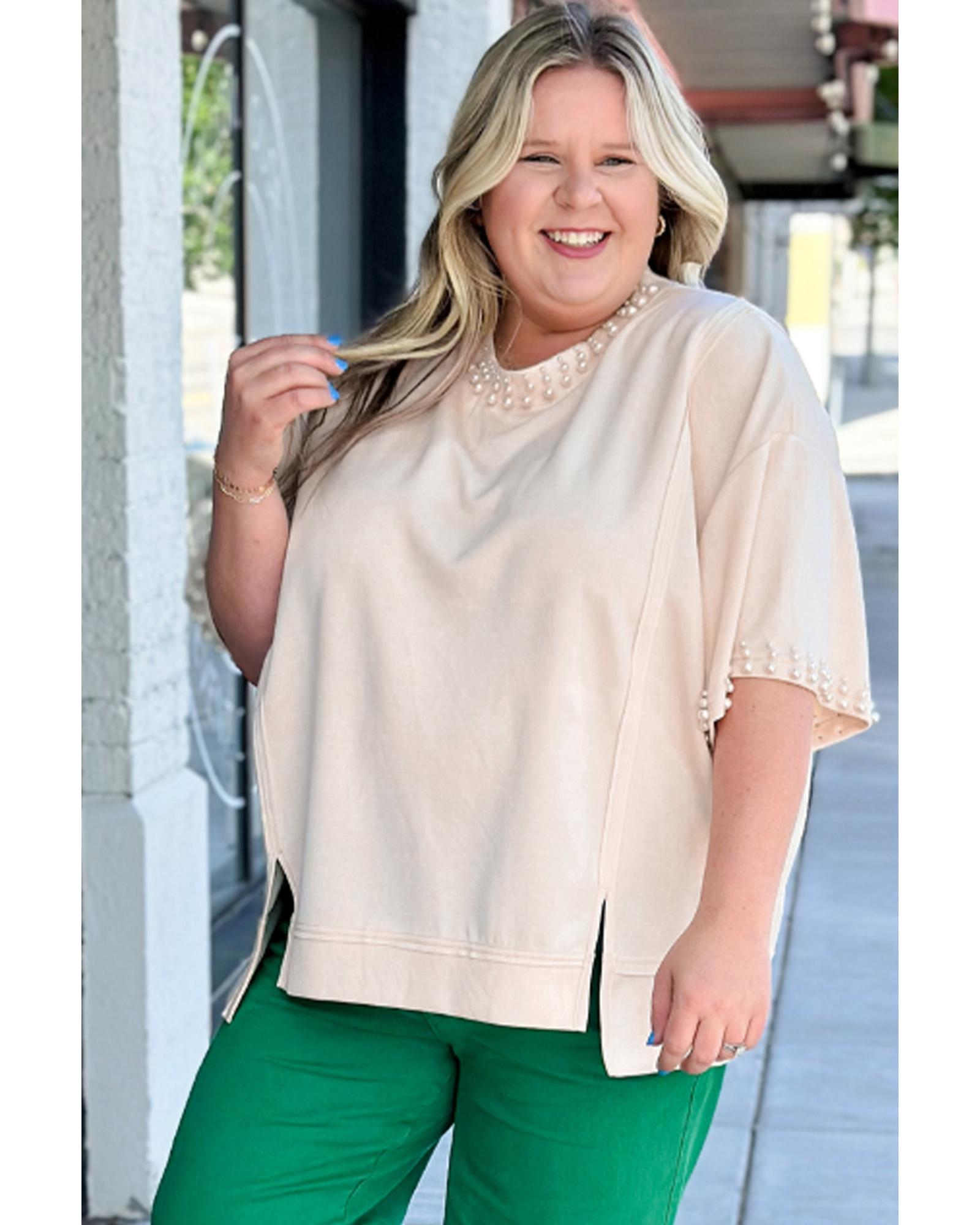 Beige Pearl Decor Crew Neck Half Sleeve Plus Size T Shirt – 1X