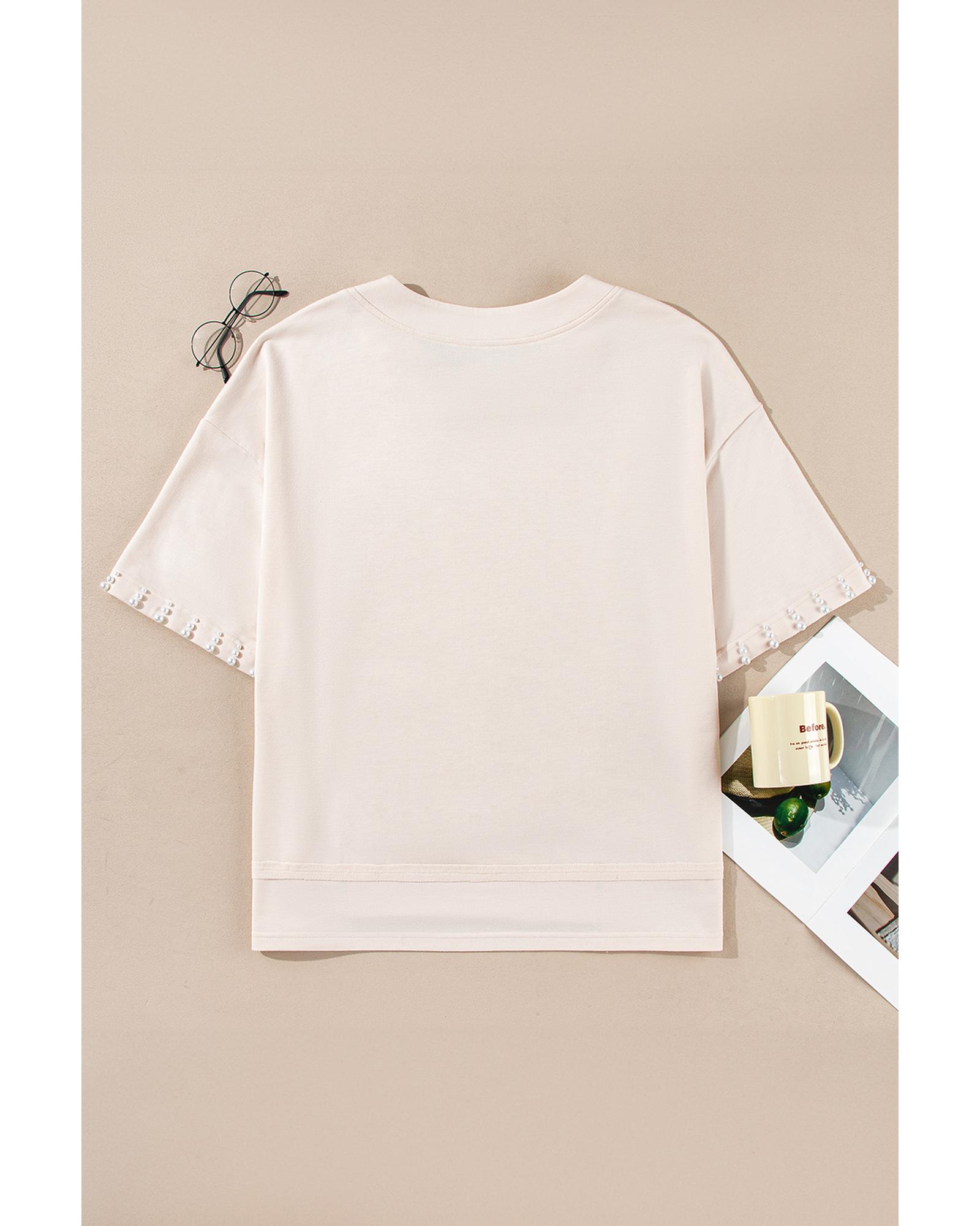 Beige Pearl Decor Crew Neck Half Sleeve Plus Size T Shirt – 4X