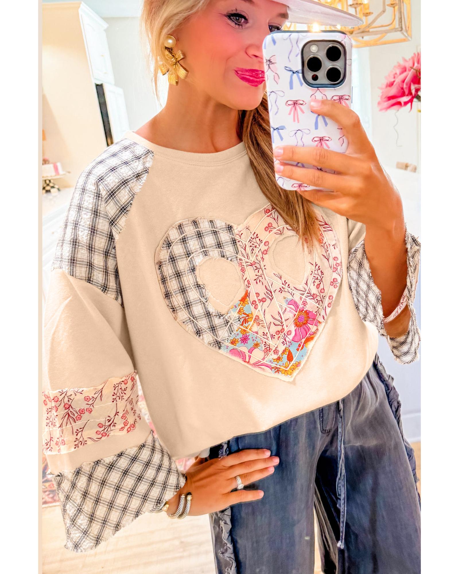 Beige Plaid Floral Peace Heart Graphic Wide Long Sleeve Top – 3XL