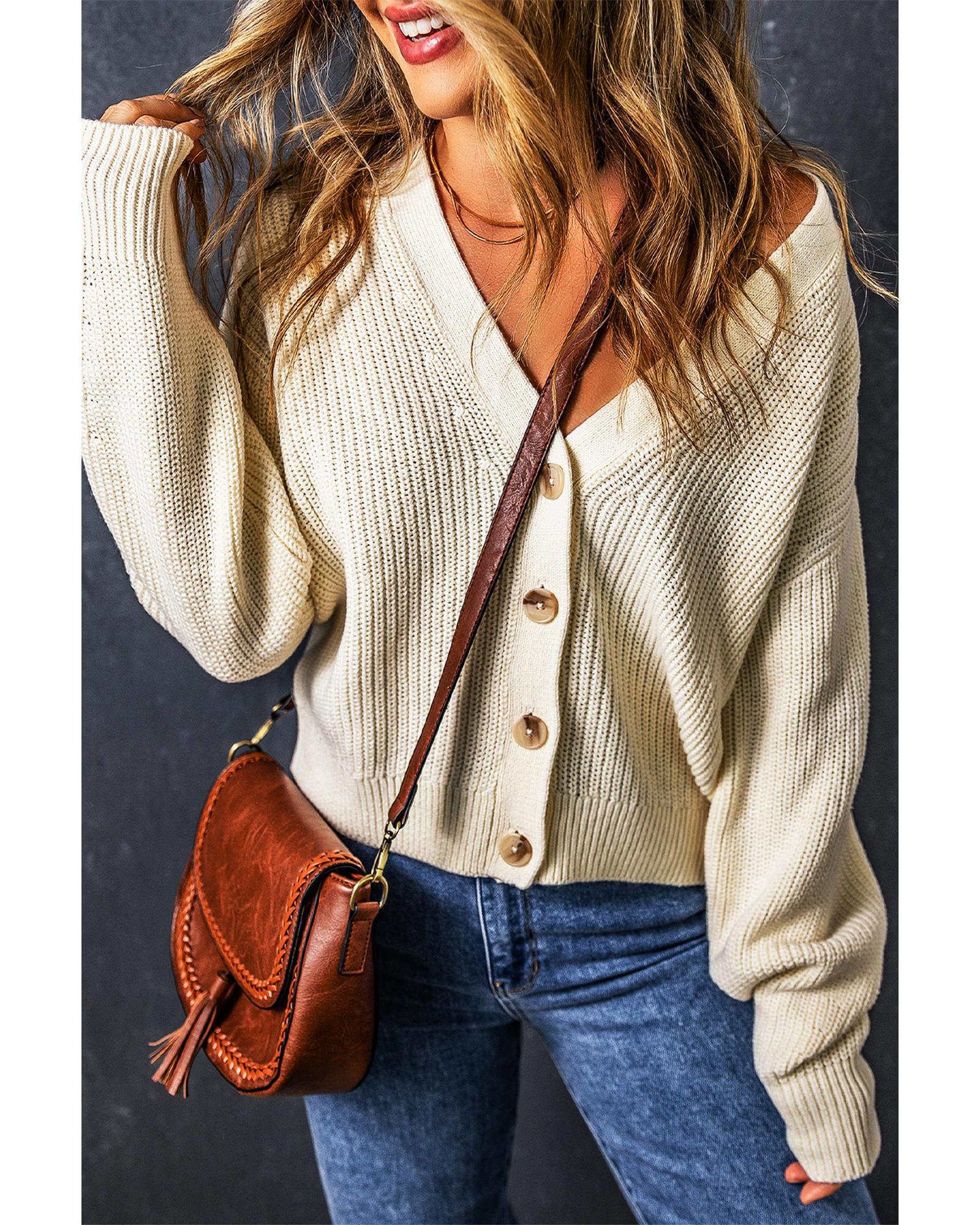 Beige Plain Knitted Buttoned V Neck Cardigan – M