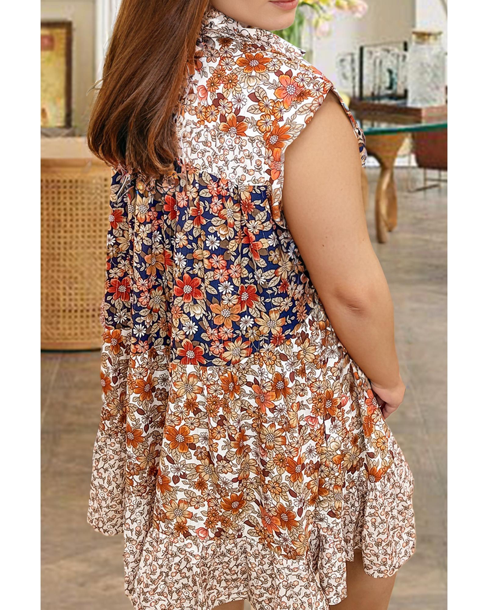Beige Plus Size Floral Patchwork Button Front Collared Mini Dress – 1X
