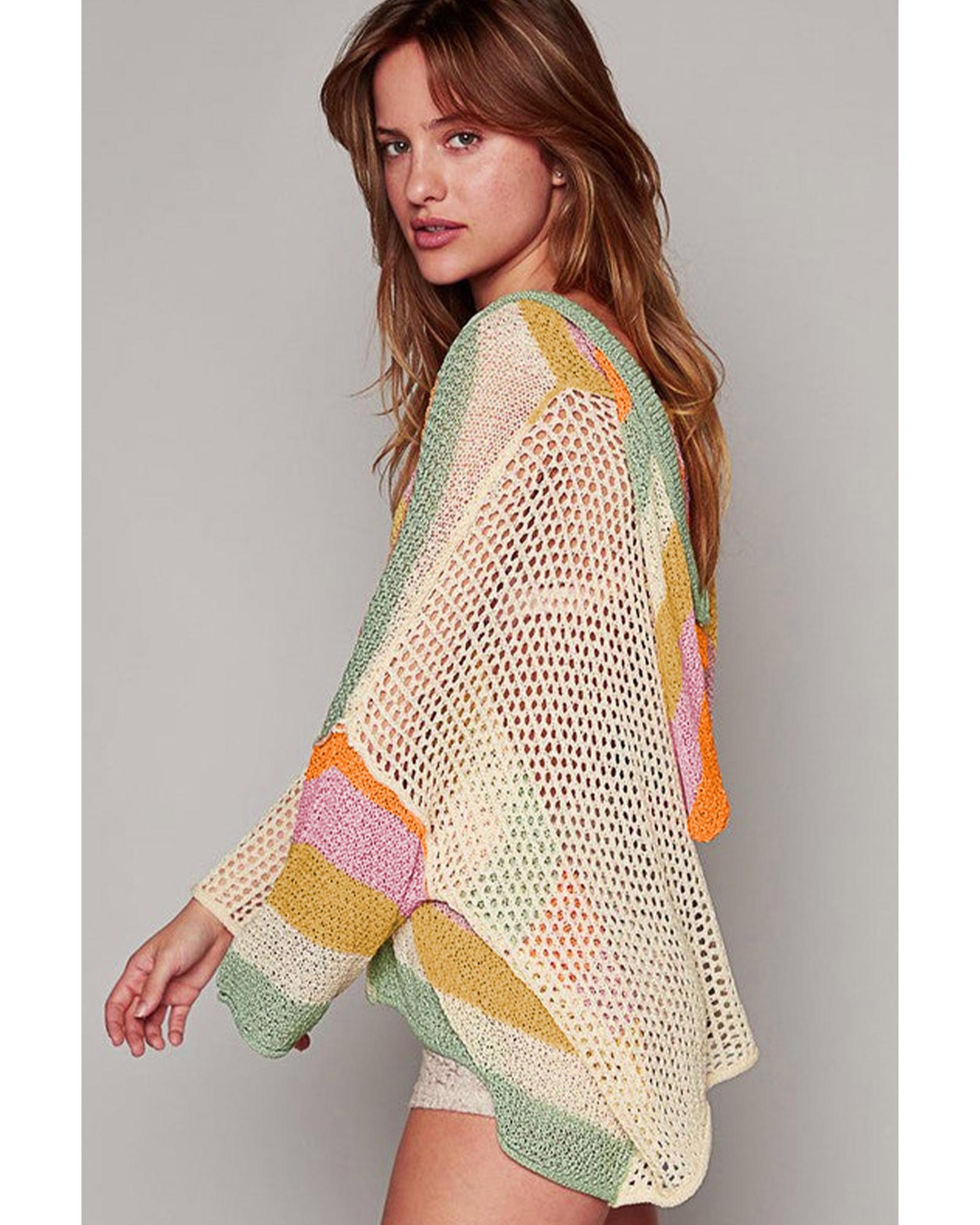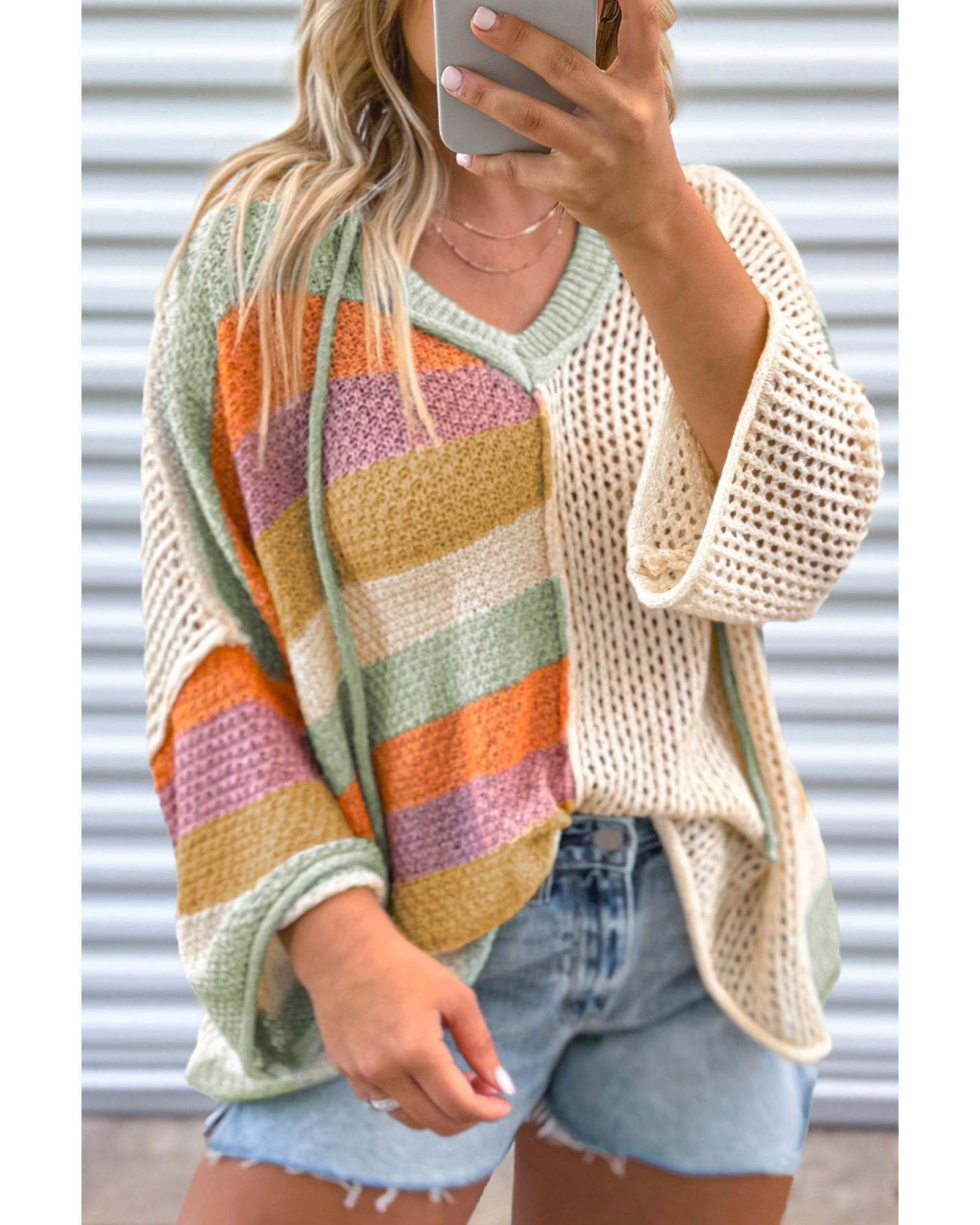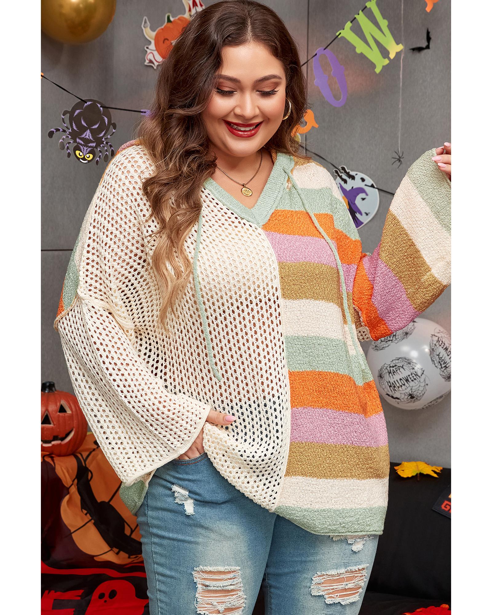 Beige Pointelle Knit Colorblock Patchwork V Neck Hooded Plus Sweater – 1X